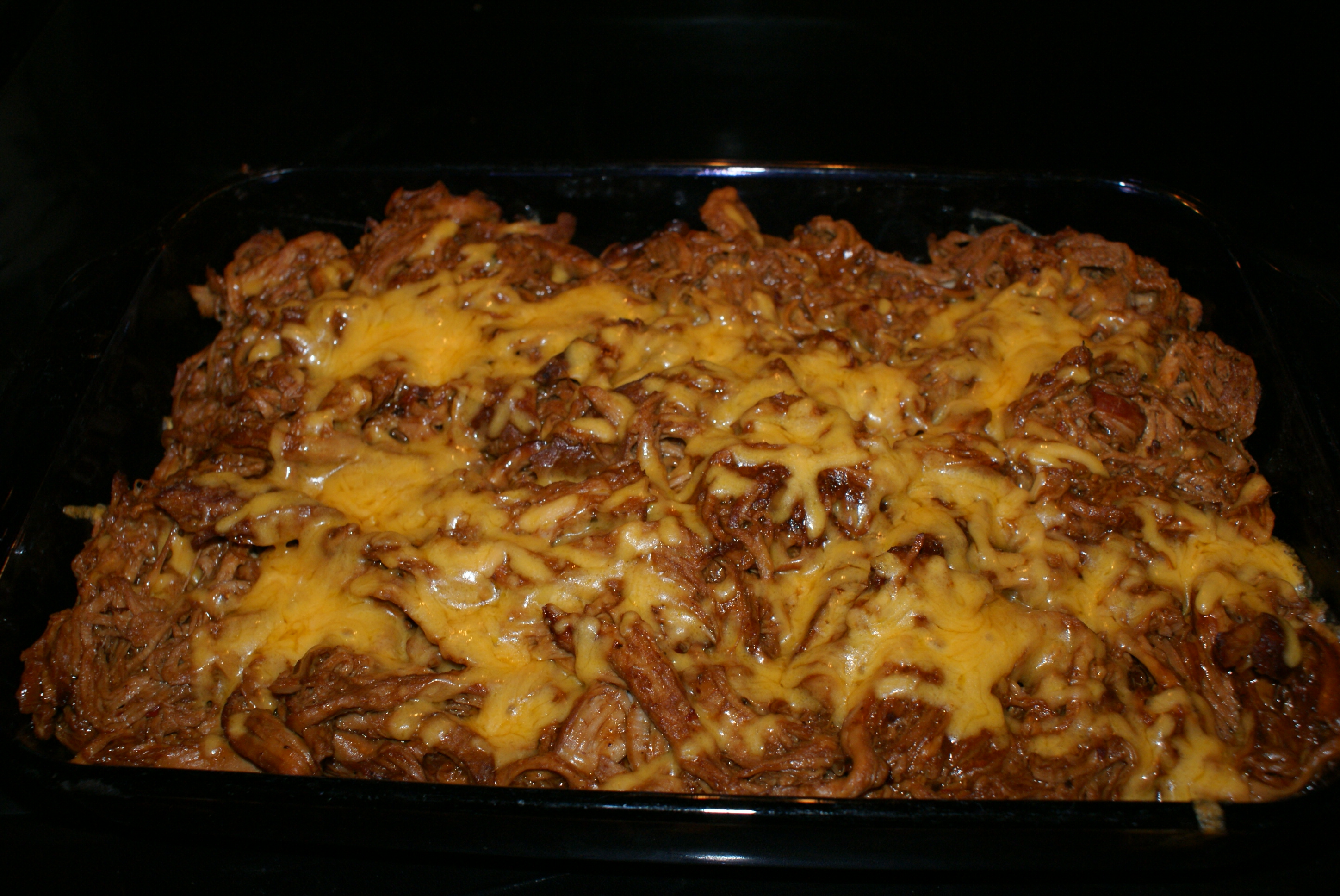 Put the whole pork loin in  the crock pot. Set for 8 hours on low. Add the bottle of BBQ sauce, brown sugar, crushed red pepper and parsley (the last 2 ingredients to taste). Cook 8 hours. When the pork is done, shred with forks and mix well into sauce. Let cook another 10 minutes while you prep the Bisquick. Get out a baking pan, I use a glass 11×13. In a bowl, mix 2.5 cups of Bisquick with 1.1/4 cups skim milk. Mix and pour into baking pan and bake at 450 as directed. When it’s done, remove from over. Turn off crock pot and top the Bisquick mixture with the pulled pork, spreading evenly. Top with cheese and bake for about 5 more minutes or until the cheese looks nice and melted. That’s all, so easy and you have a simple, heavenly, eat!! Hope you all had a great weekend!