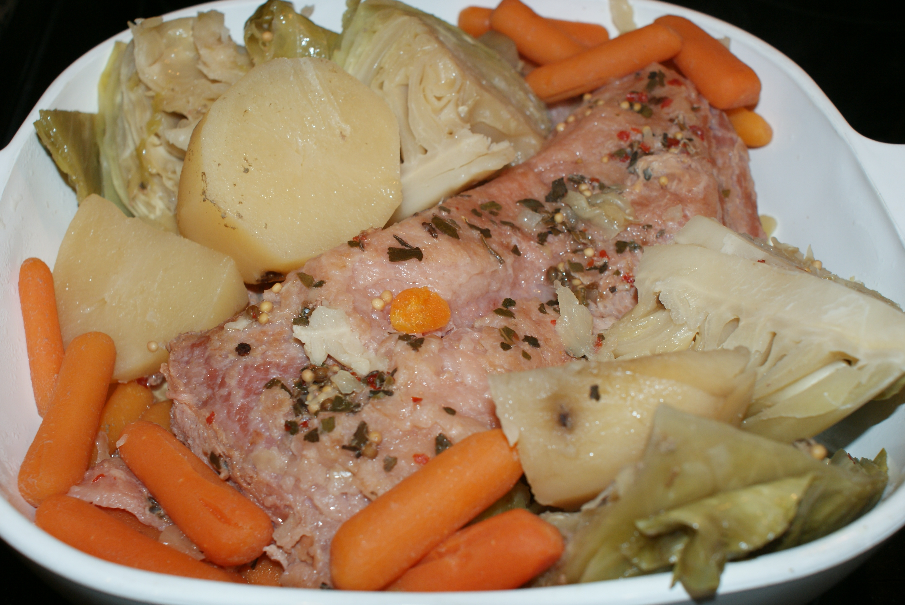 Today I made my annual St. Patty’s Day meal, Corned Beef and Cabbage! I love this meal, I’m the only one in my family who loves it though! My husband likes it enough as long as he doesn’t have to eat the cabbage and is a great sport about eating it with me! I crock pot mine because it’s just so easy and so tasty and it was perfect today as we were going off to church, I put my meal in the crock pot before heading out and let it cook all day and dinner was done! I did also make a side of green mashed potatoes for the kids, they love to have a green dinner once a year! I bet there are a million blog posts on corned beef and cabbage every St. Pattys day, so here’s to a million and one:-)