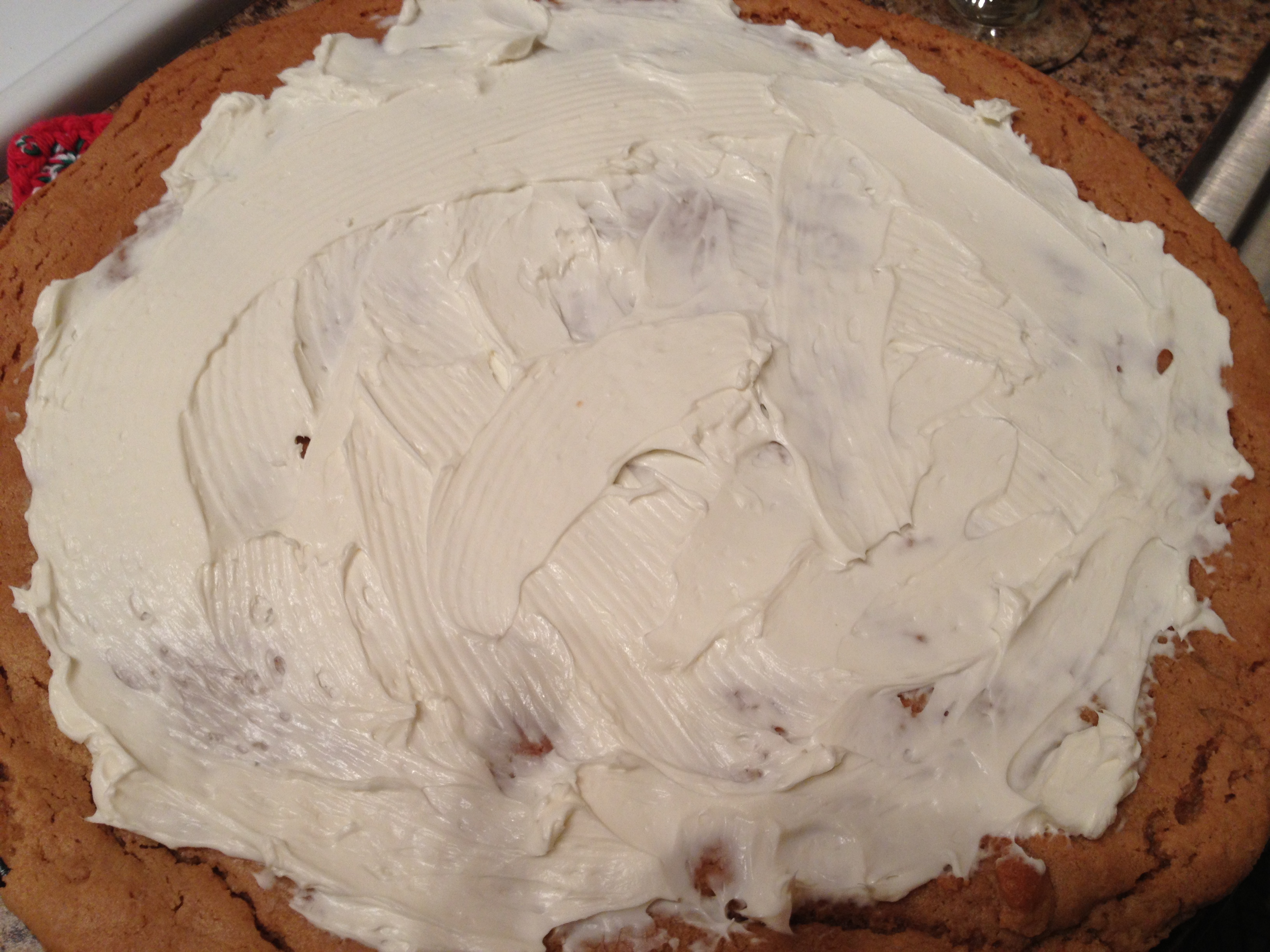 Make the cookie dough per package directions. Flatten it out on a pizza stone or what ever pizza pan you use as you would with pizza dough. Bake at 375 for about 15 minutes or until cooked, then set aside to cool.