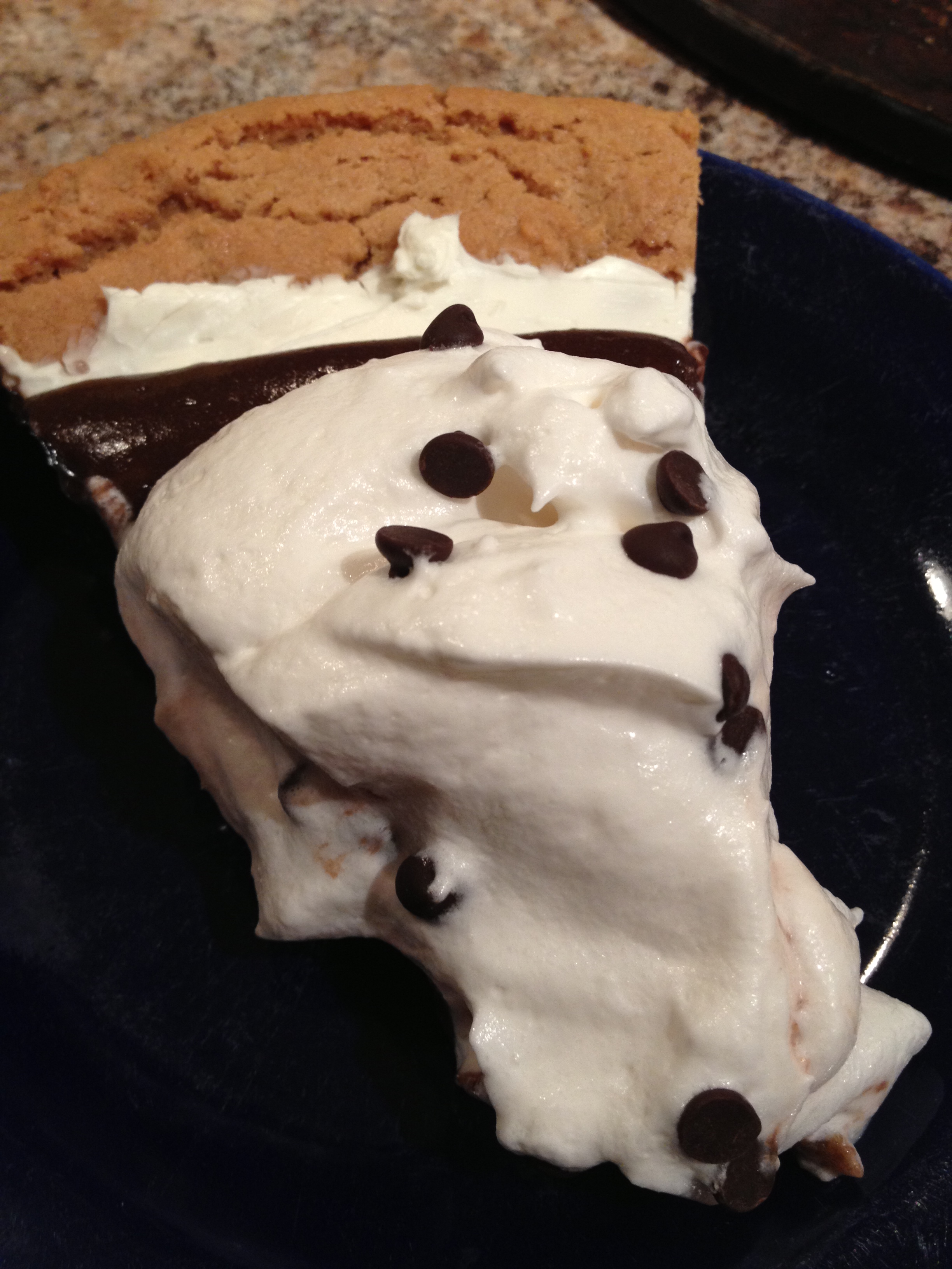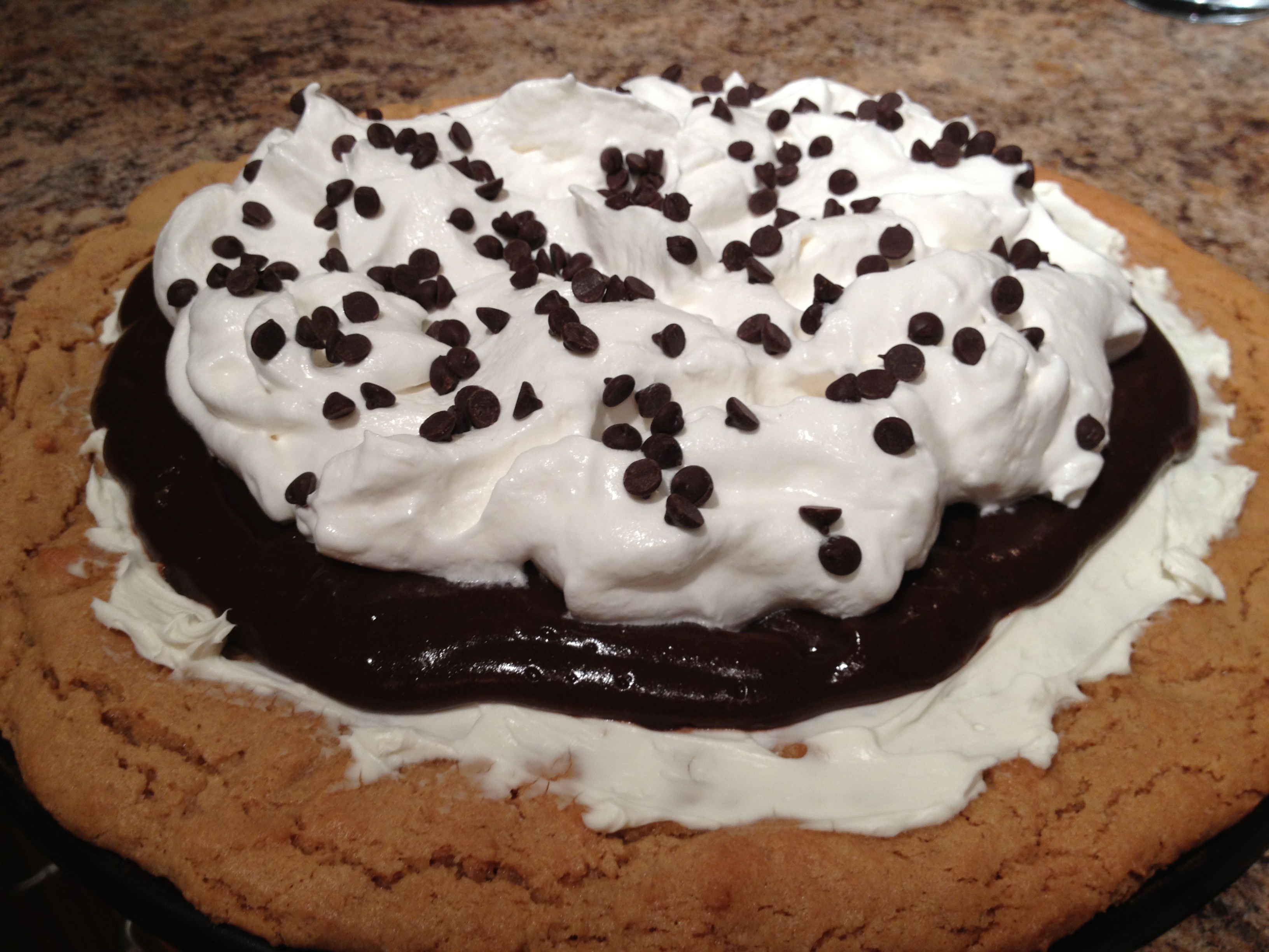 While cookie is cooling beat the cream cheese with electric mixer in a mixing bowl until smooth. Spread over cooled cookie. In another mixing bowl beat the milk and pudding mix on medium speed for approx. 2 minutes. Spread the pudding over the cream cheese layer. Refrigerate for about a half hour (or until the kids or whole family just can’t wait anymore to dig in) then spread with the whipped topping. Sprinkle with the mini chocolate chips. If you can wait you can chill for about an half hour to an hour to help it set better, however, that step doesn’t happen in our house and it turns out just fine! Enjoy! And again, go like my Facebook page if you would!