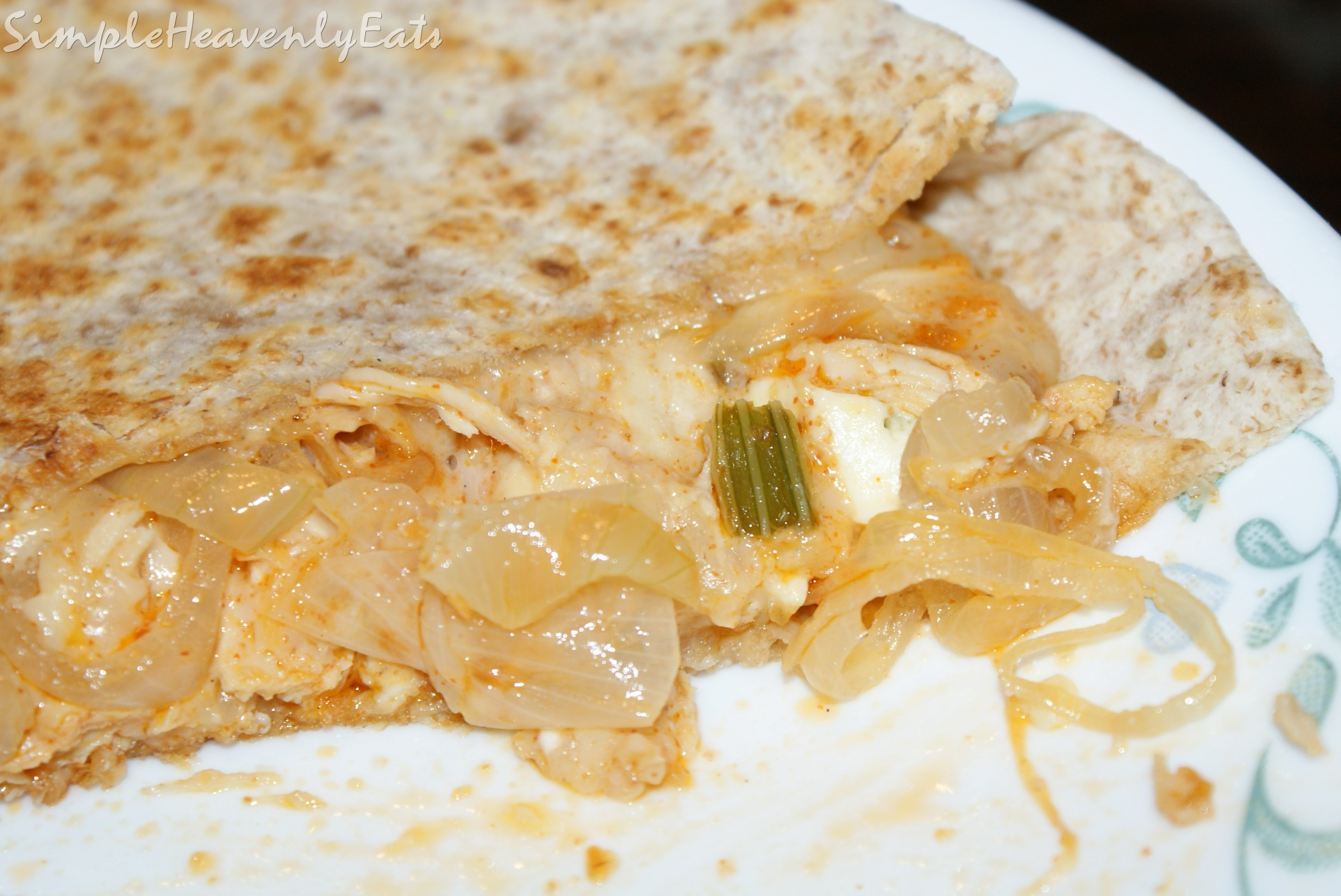 First you want to marinate the chicken in hot sauce for about an hour or more before cooking. Preheat over to 350 and bake the chicken until done. When it’s done, shred it and add some more hot sauce coating well and then put contents into a large bowl. Now slice the onions and dice the celery and saute in an oiled frying pan until browned. When done, add to the chicken mix in the large bowl. Shred the cheese, using most of the block of cheese, add about half a cup of blue cheese crumbles and mix together well. Heat oil on a frying pan, I used my flat skillet that I make pancakes on. Place a tortilla on the pan, add half the mixture (the tortilla will be full!) then top with another tortilla. Cook for about 2-3 minutes then flip and do the same on the other side. Put on a place, cut into 4 and serve! I made 2 of them tonight, we did have some left over mixture that we saved, or you could make another quesadilla.