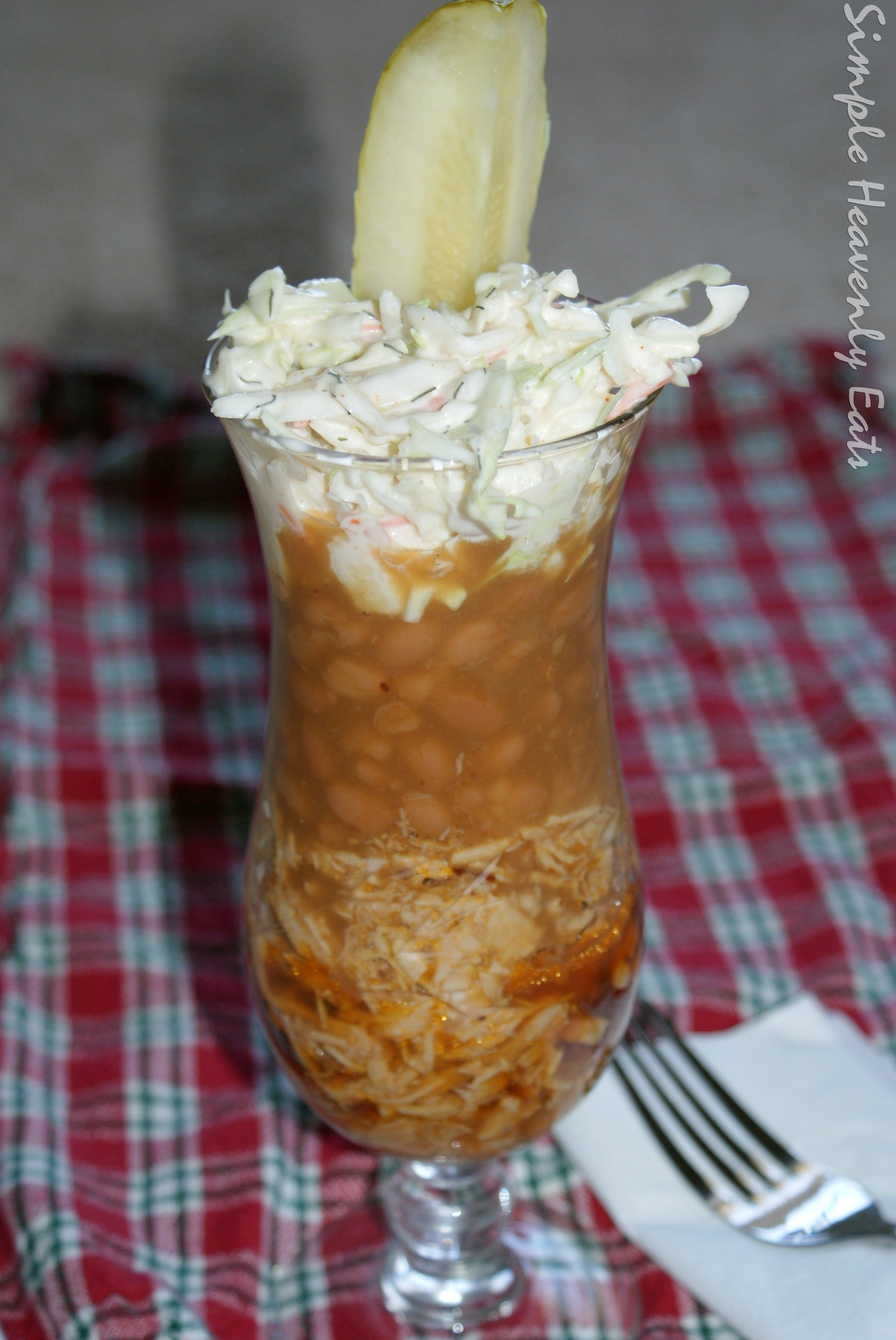 The last 20 mins after you shred the pork, make the beans in a sauce pan as directed on can. Or you could be ambitious and make your own beans, but that would require time:-) When everything is done, the fun begins. Find your sundae cups. First place a good amount of pulled pork in the cup, then add beans, then the slaw! Add a dill pickle and you have a great delicious meal. This is not for people who don’t like their food to touch obviously!  Enjoy!