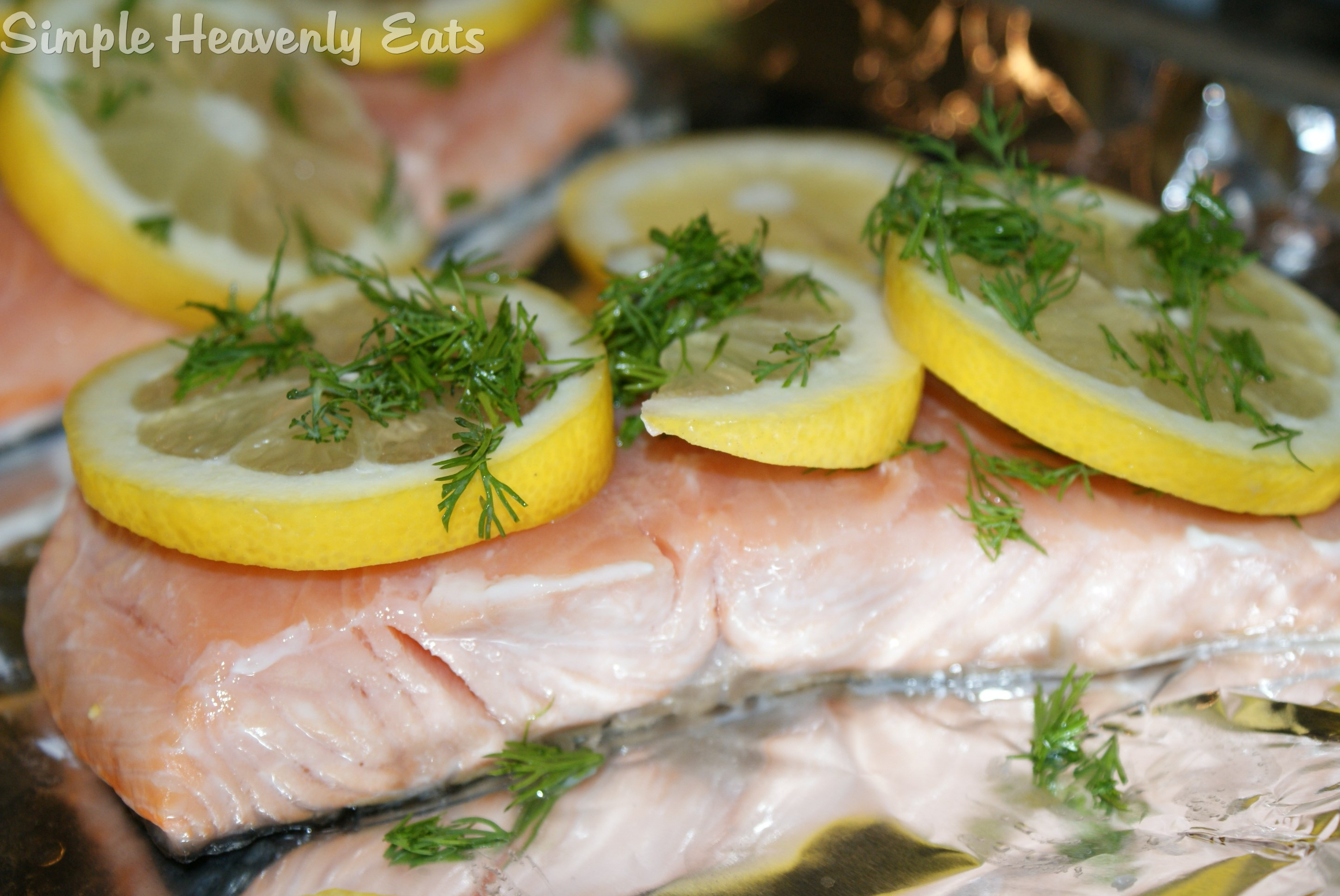 Line a broil pan with foil (trust me, it makes clean up a cinch!) place fillets skin side up. Turn broiler on low and place fillets under broiler. (Broiler rack should be at the top level) Broil like this for about 5 minutes or until you see the color start turning and looking partially cooked. Remove from oven and carefully flip the fillets to skin side down. Take a couple lemon slices and squeeze the juice over the fillets, add some dill (I do quite a bit) then place the remaining lemons on top of the fillets. Top with more dill and broil for about 15 minutes or so. If you’ve broiled salmon you know what to do! If not, watching closely is key, much more than timing so keep a close eye on them, I rotate the pan once in between for a nice even cook, and when they appear cooked and are nice and flaky to the fork you are done!