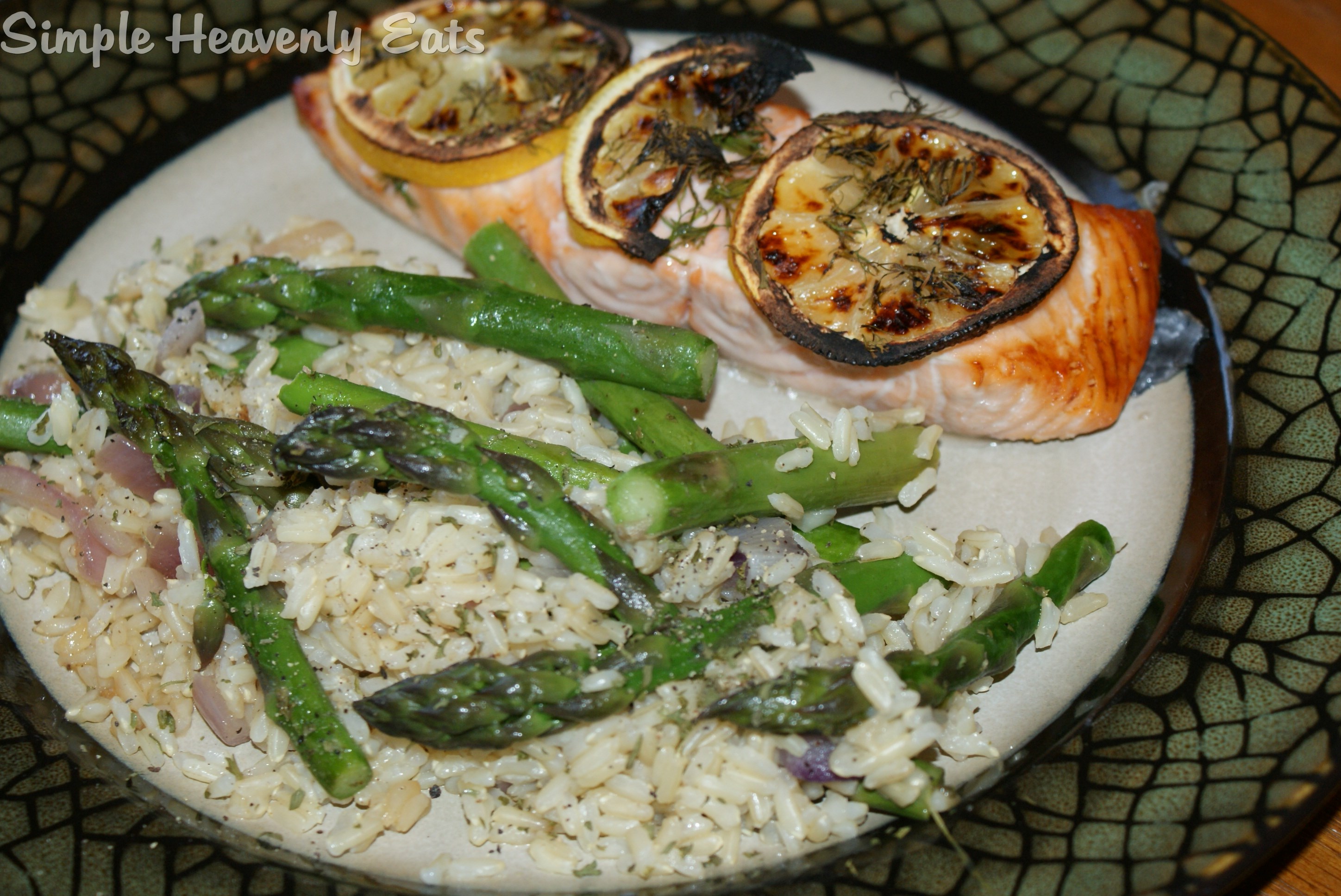 Hello my Simple Heavenly Eats friends! I want to say “Smile, we are halfway through the week” but we should smile everyday no matter what day it is, every new day is a blessing! I want to share a simple Salmon recipe with you that we love in our house (let me rephrase, that my husband and I like!) Eating healthy can taste good with little effort too! We are getting back on the healthy bandwagon as a general rule in our house and I have lots of really yummy healthy recipes. We had this salmon last night and I planned on having asparagus and brown rice as sides and decided to combine them and make a yummy side verses just a blah boring side. This dinner was….what am I going to say? Yes, HEAVENLY! Here’s what you need to know, it’s easy as can be!