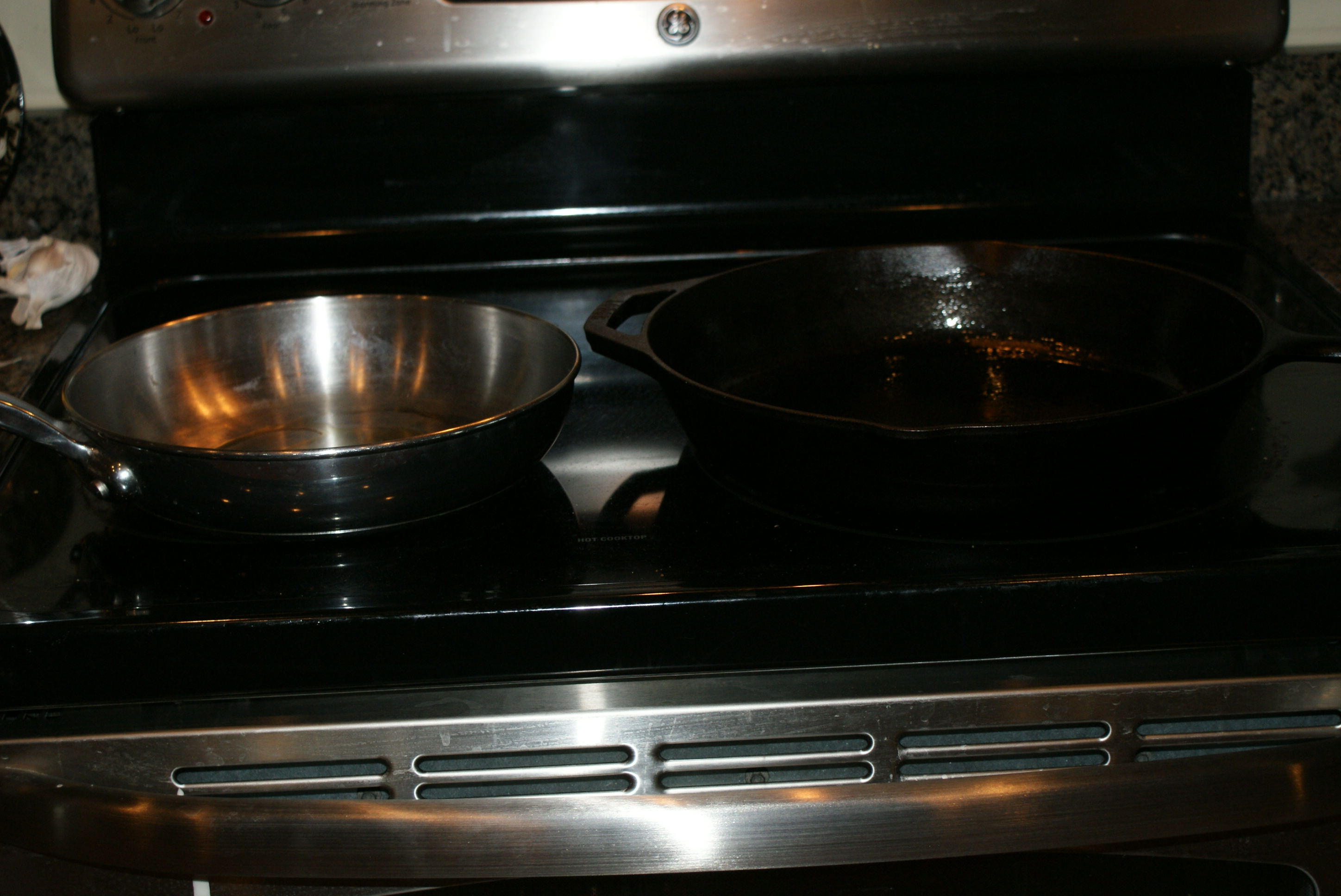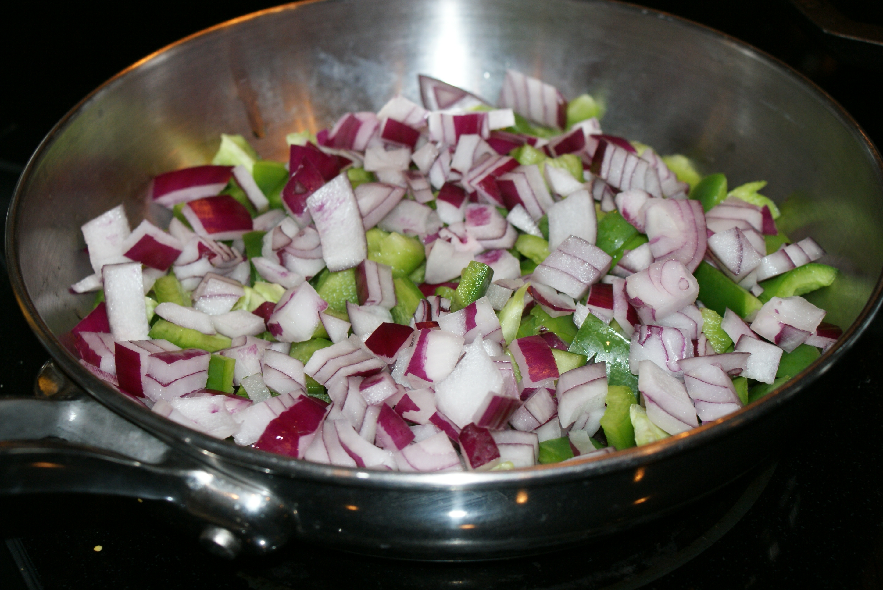 Saute onions and peppers until browned, add garlic clove and saute about 1 more minute, mixing well. In the meantime place oil in skillet and heat.