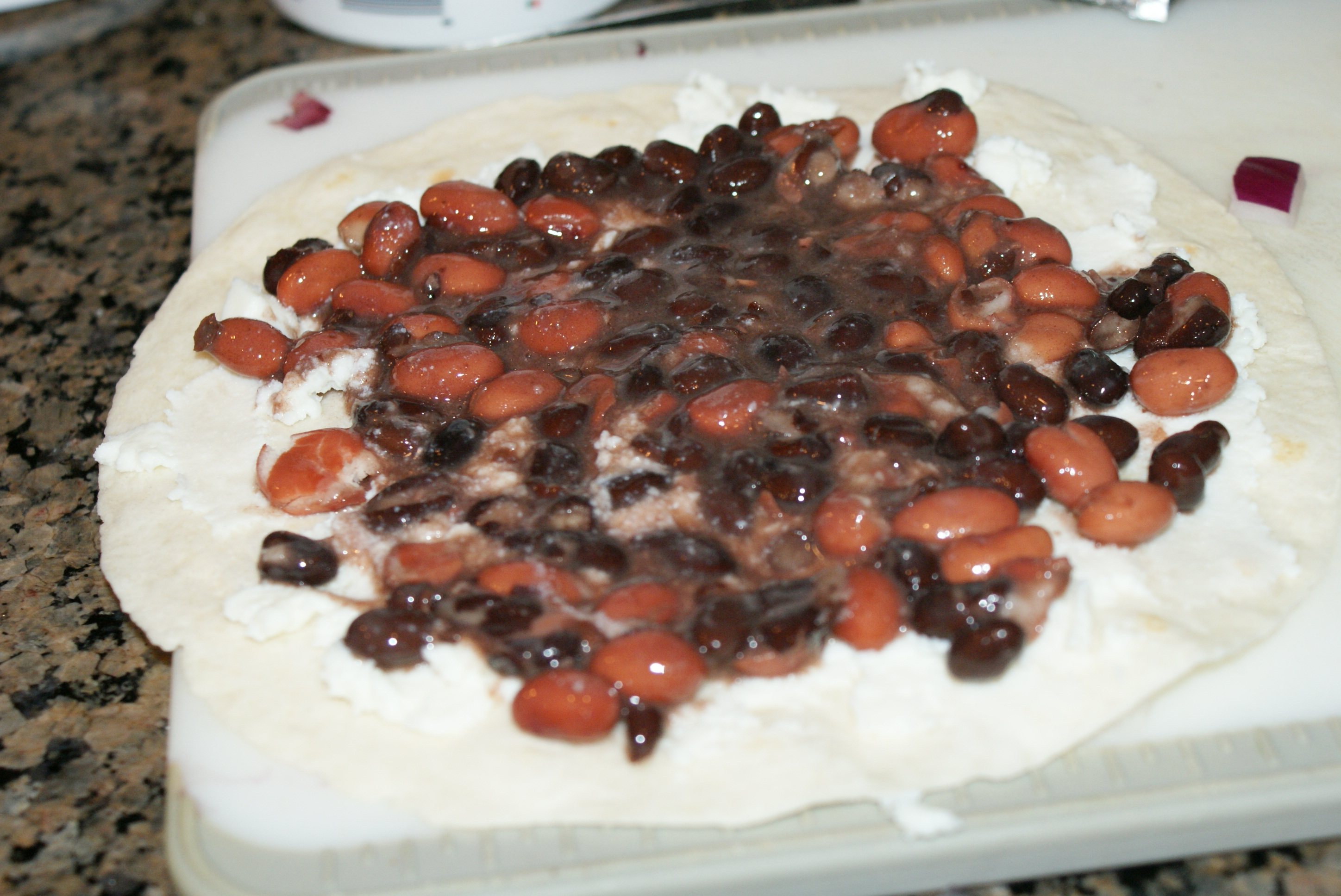 Prep tortillas and cook them one at a time. First add a thin layer of ricotta to the tortilla.