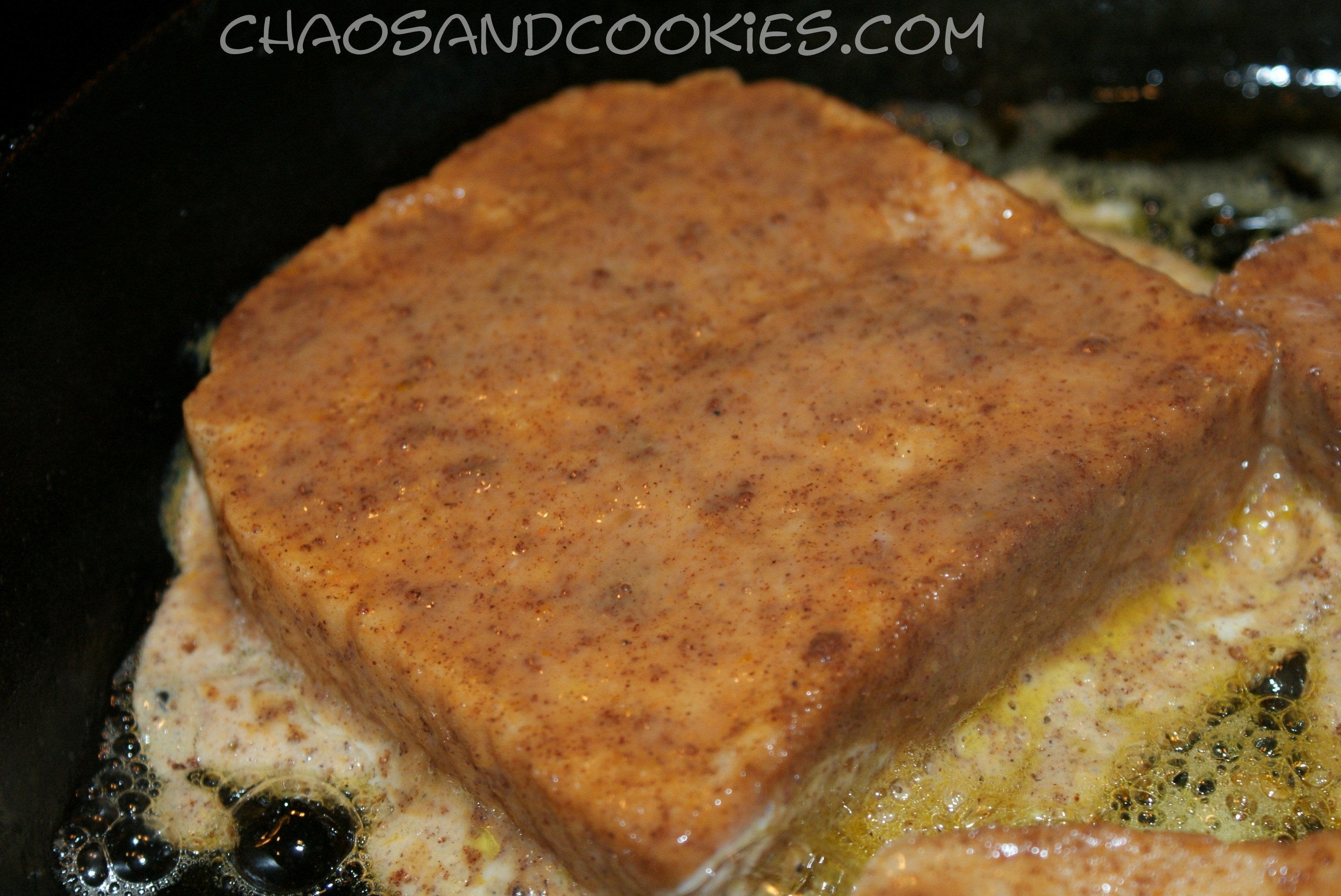 SONY DSCNow your skillet or pan should be nice and hot and ready for use. Dunk your bread, one slice at a time, into the pumpkin/egg mixture making sure to completely coat well. Slide that bread right onto the griddle and fit as many as you can on the pan, but allow enough room for flipping them. 4 is probably the max to do at one time. SONY DSCRepeat this until all the toast and egg mixture is used up!