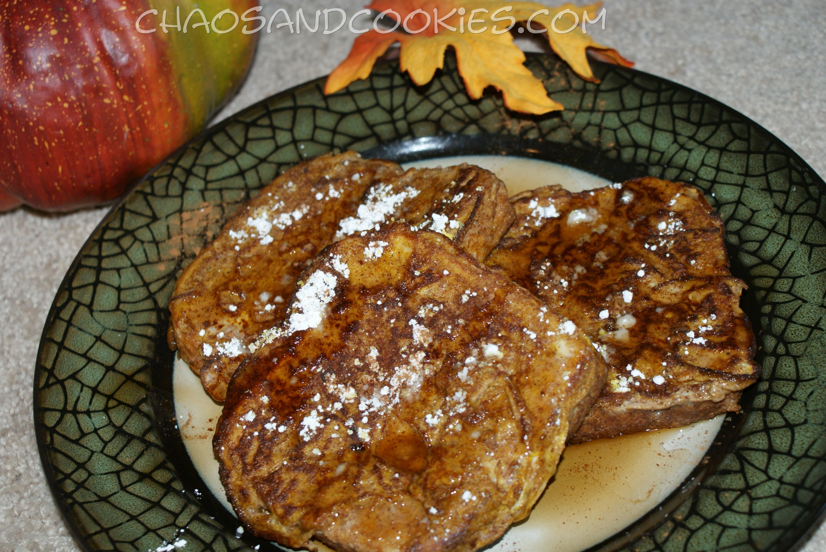 SONY DSCI’m forcing myself to sit down and blog this fantabulous French Toast Recipe that I made for dinner tonight. It was so full of fall spice and flavor, our bellies are happy, full and content and my house smells amazing! Who would know by sitting here at my breakfast table that it was humid as all get out today?! It’s all about the ambience inside! I also managed to dig out some fall decorations this morning and start getting the house festive, as well as take another trip to Starbucks for a Pumpkin spice Iced coffee, delish! It’s such a cozy fun time of year! If you love pumpkin and you love french toast, than you should really make this recipe. And if you don’t, are you human? Ok, I’m kidding, not everyone is a pumpkin fan, I’m not sure how since I’m obsessed, but it’s true that it’s not for everyone! If you think you don’t like pumpkin, you should give it one more try for me with this recipe and it just may change your mind;-)