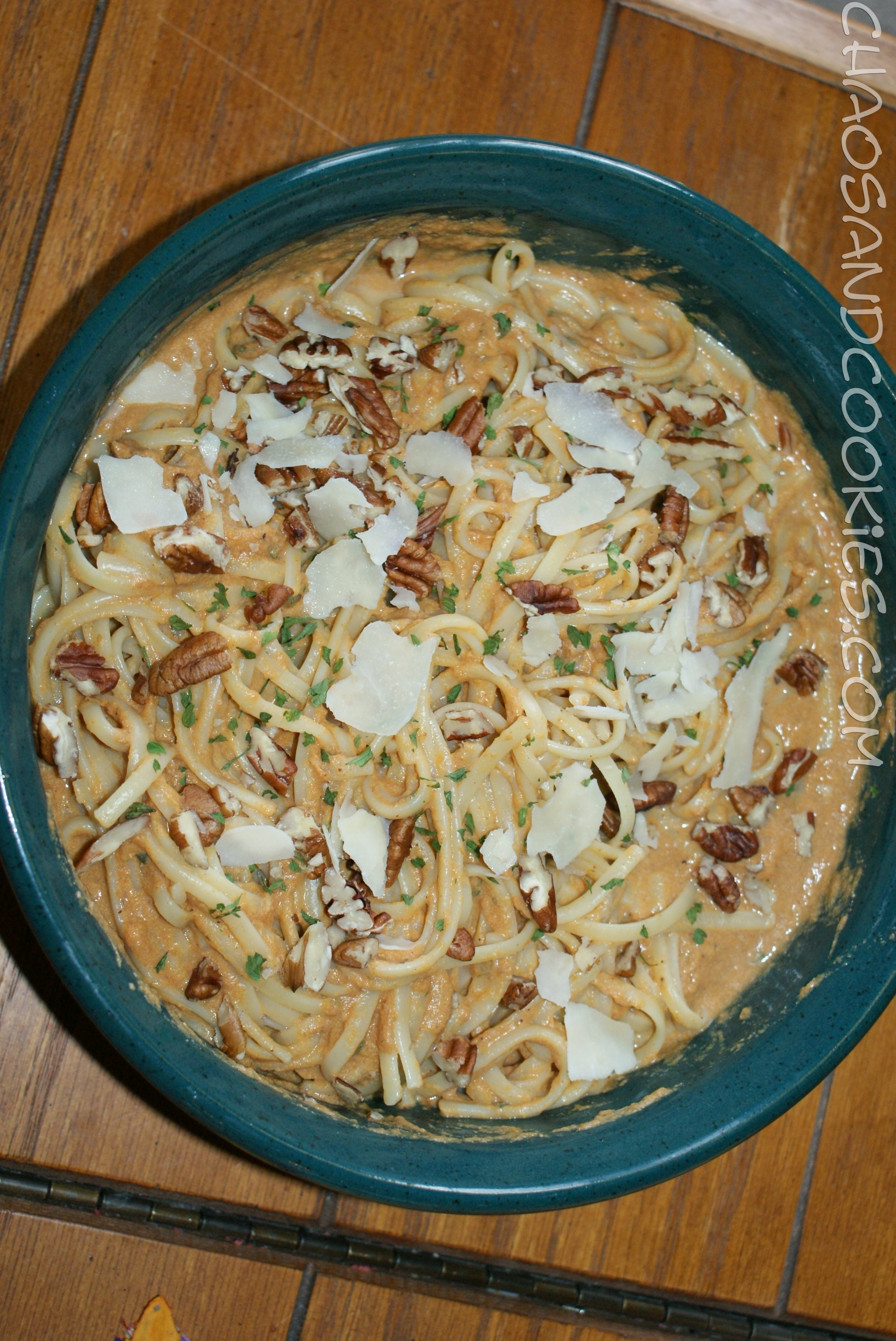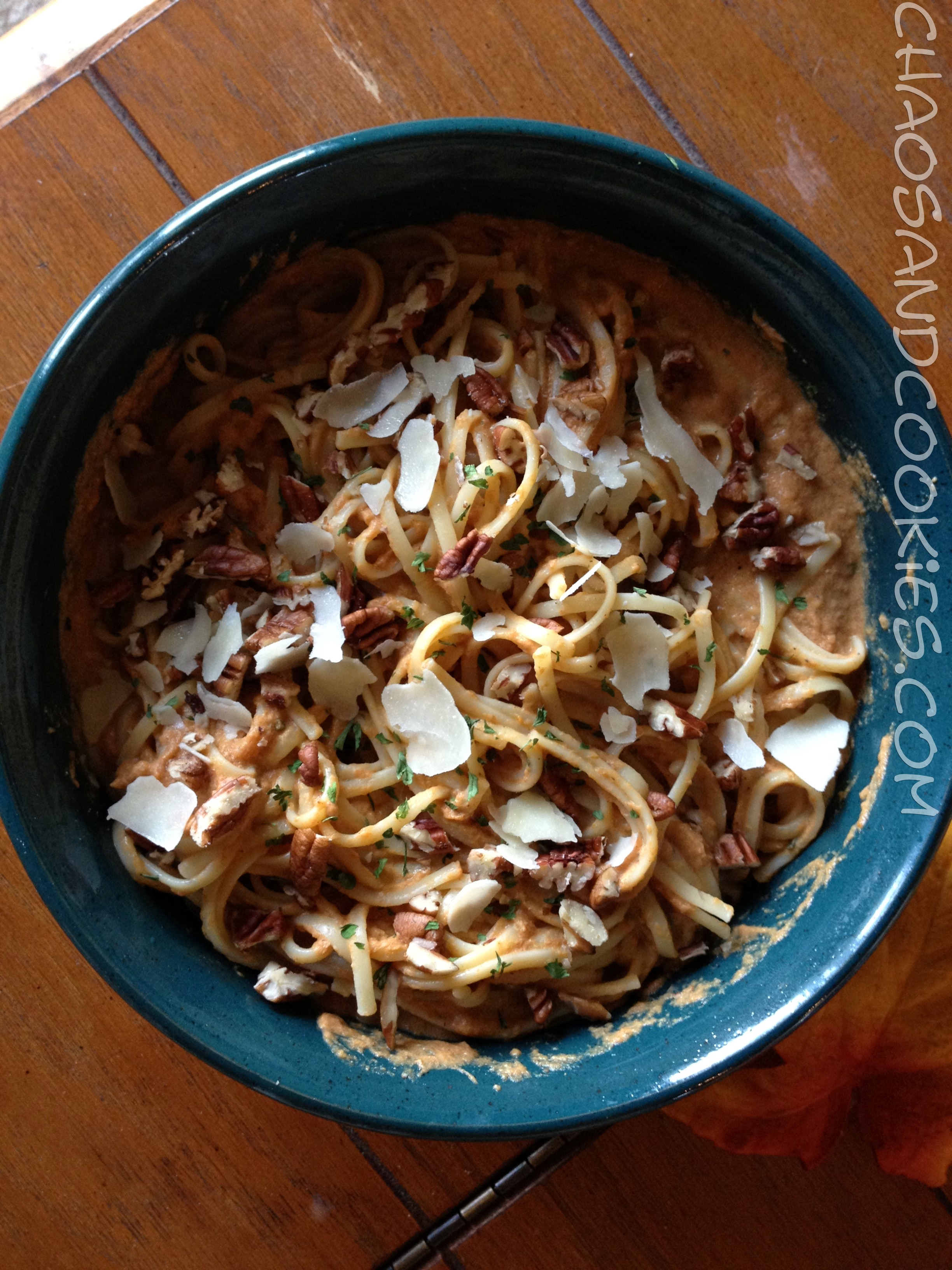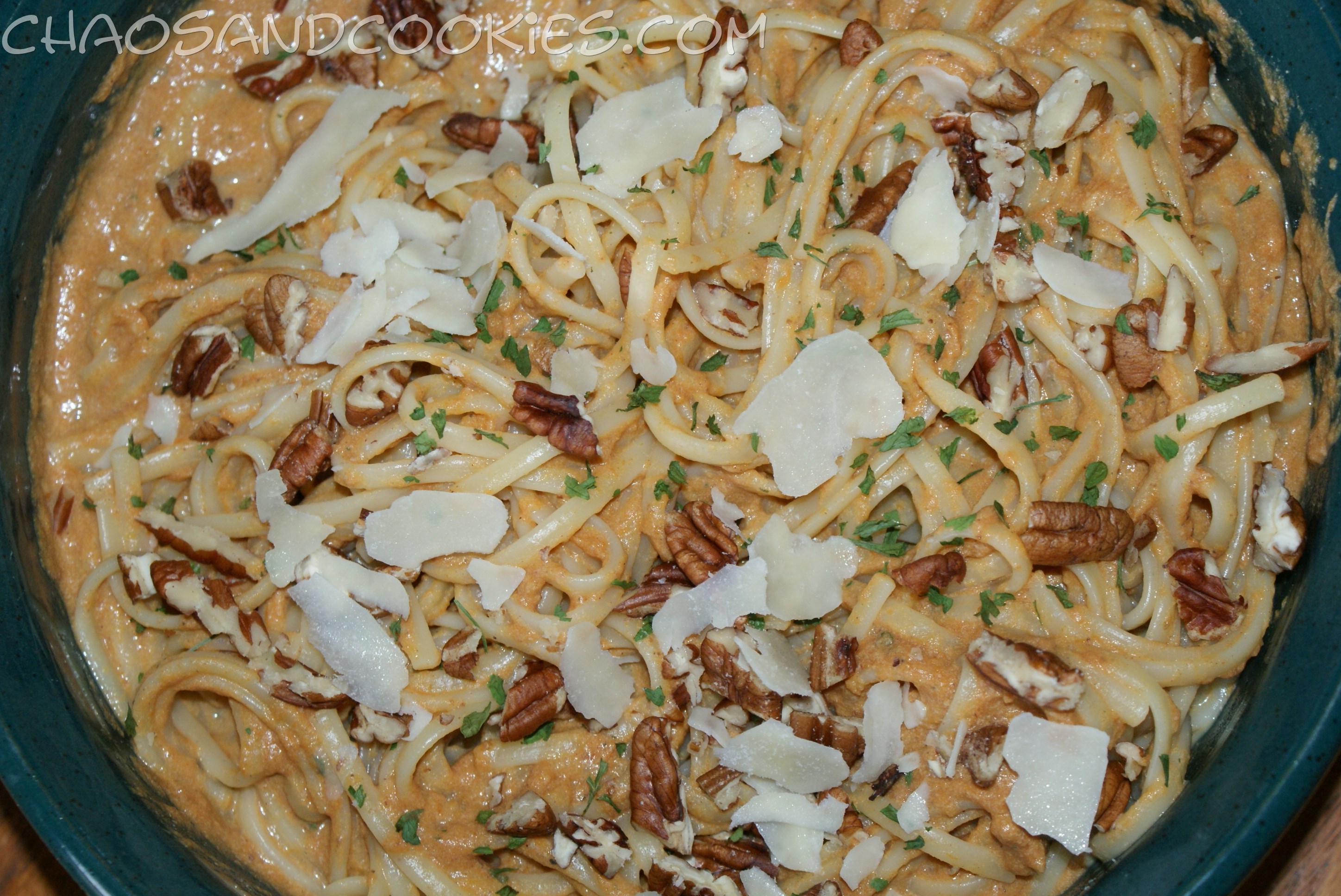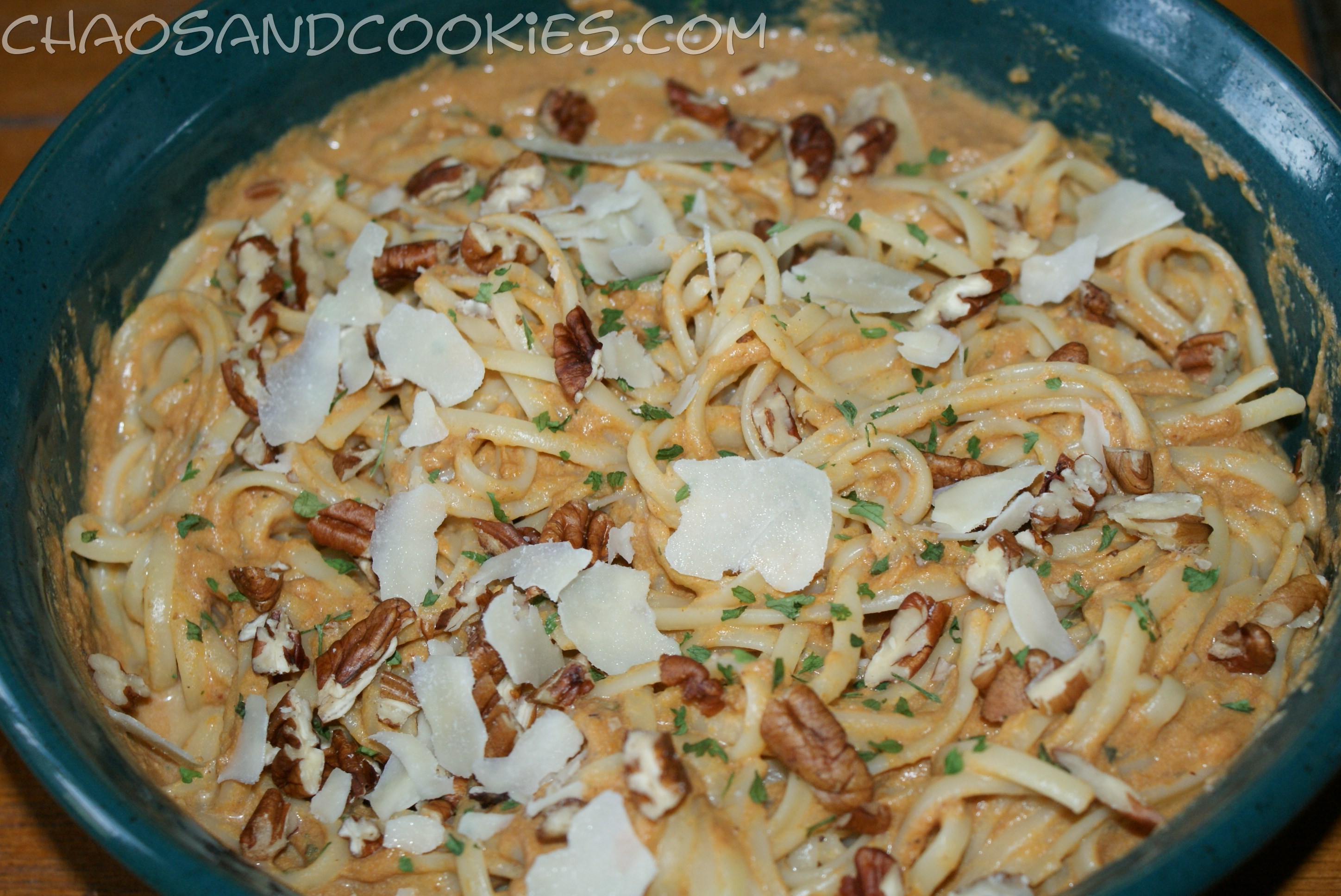 Ok, so we are done with the Chaos part of the blog, now onto the cookies! Well, not exactly cookies this time around, but the food! I’m extremely pumpkin obsessed right now, as I am every year at this time! I made an incredible dinner last night, it was a nice simple pasta dish, linguine, with a delicious creamy pumpkin sauce. It was a perfect “almost” fall dinner! Yesterday was a big cooking day, I just couldn’t get out of the kitchen! I made 2 loaves of homemade bread, pumpkin bars with cream cheese frosting and this dish I’m about to give you the recipe for!