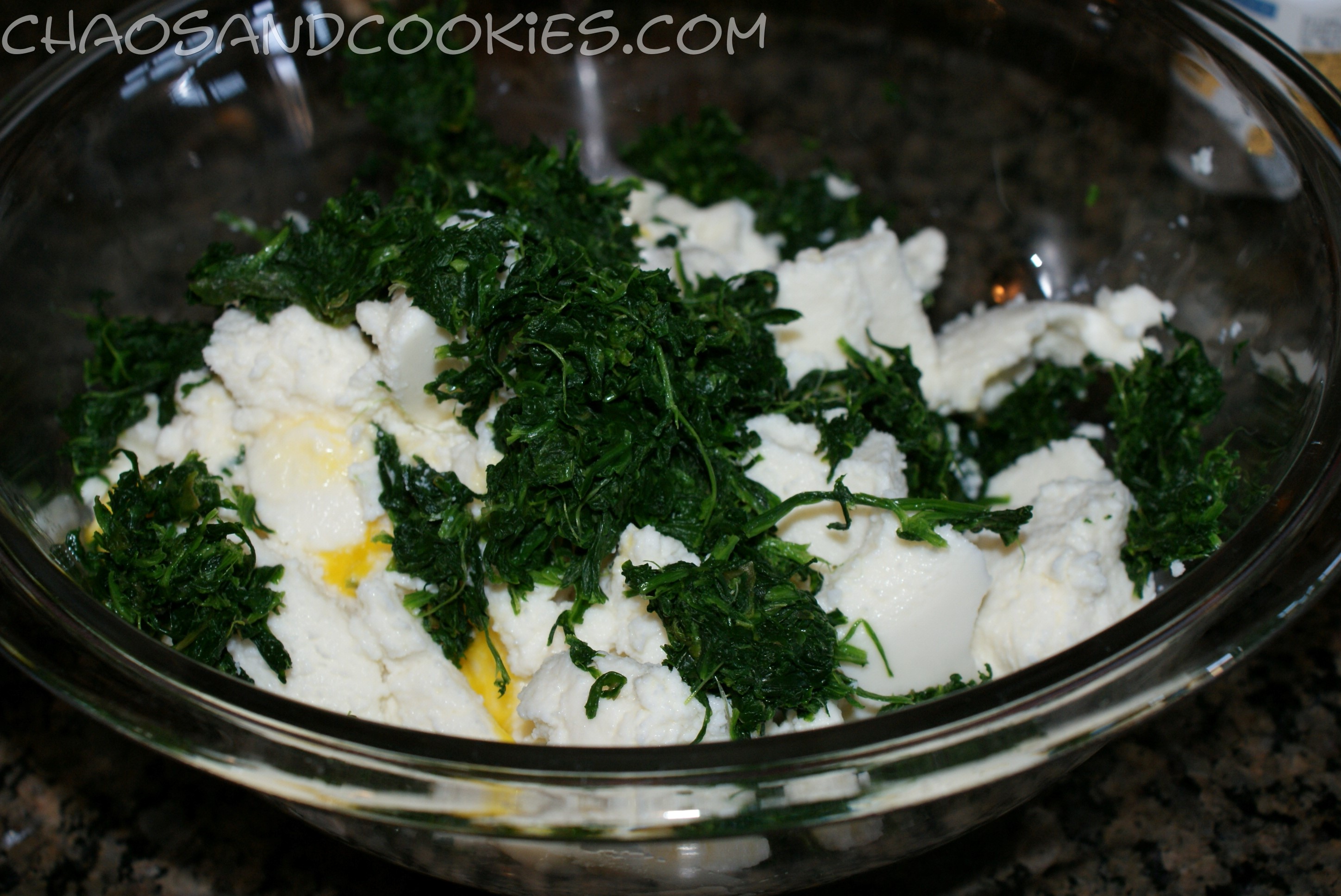 Make your lasagna noodles as directed on package, set aside. Defrost and squeeze water from your spinach. In a medium size mixing bowl add your ricotta, egg and spinach.