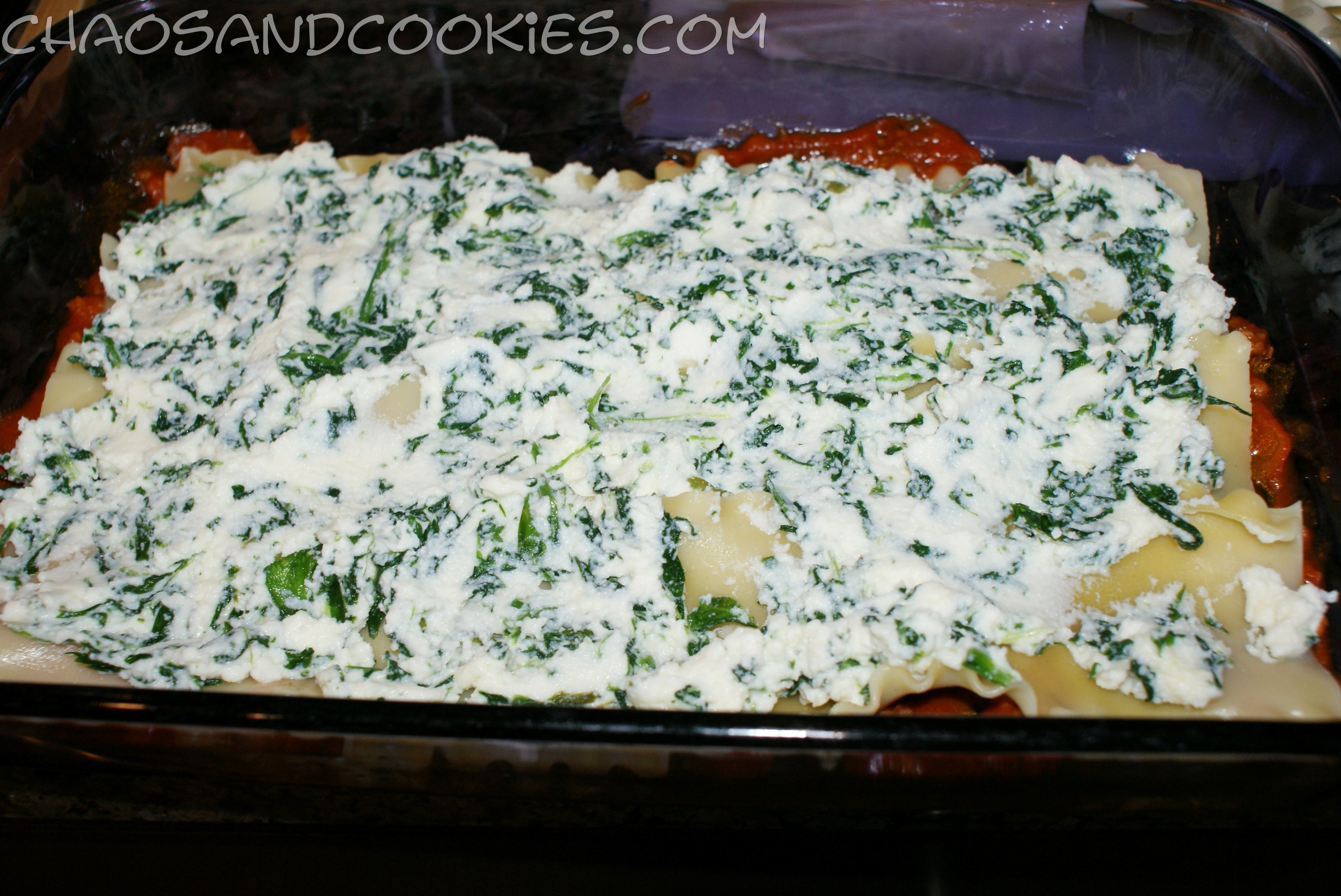 Get out a 9 x 13″ baking pan. Lightly cover the bottom of the pan completely with a thin layer of sauce. Apply a layer of lasagna noodles (3 across, slightly overlapping). Add a layer or ricotta.