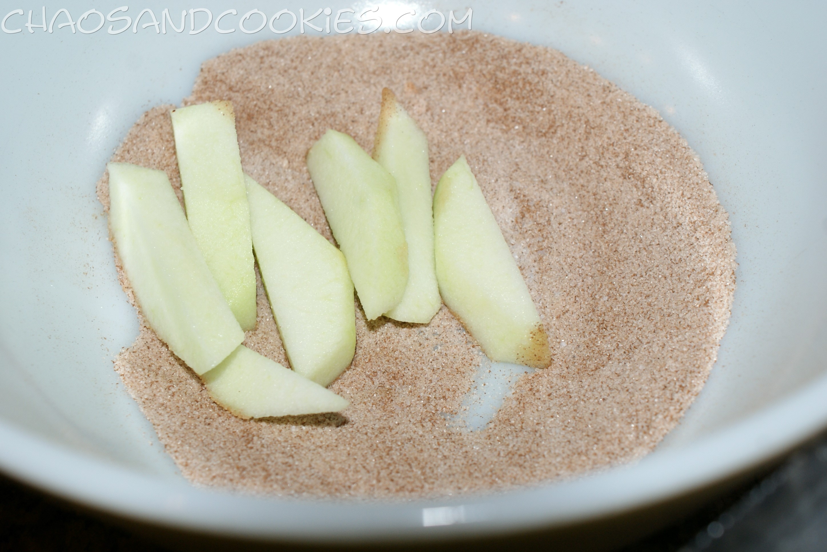 Grease your baking dish and preheat your oven to 350 degrees. In a large mixing bowl mix the sugar, salt and cinnamon together.