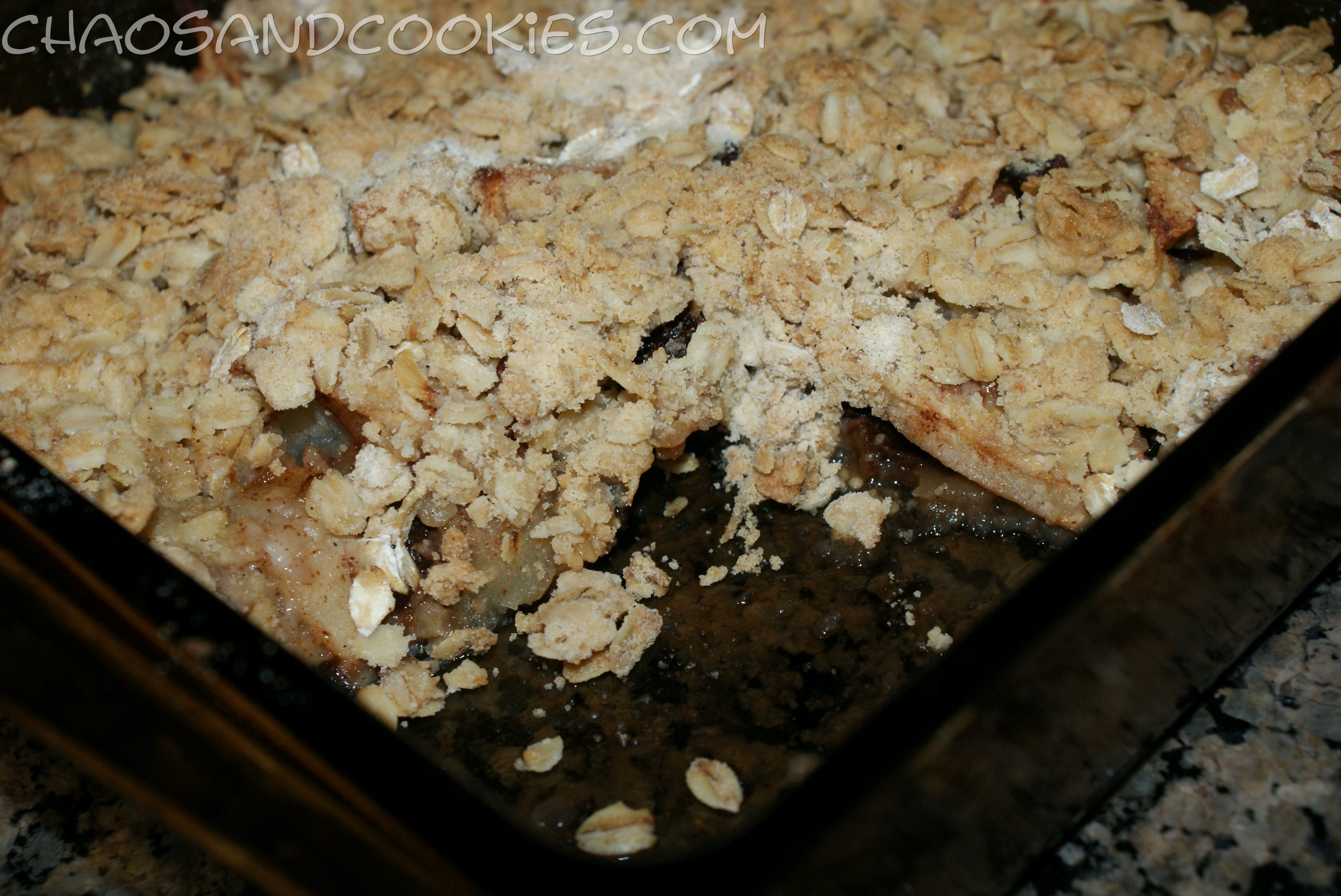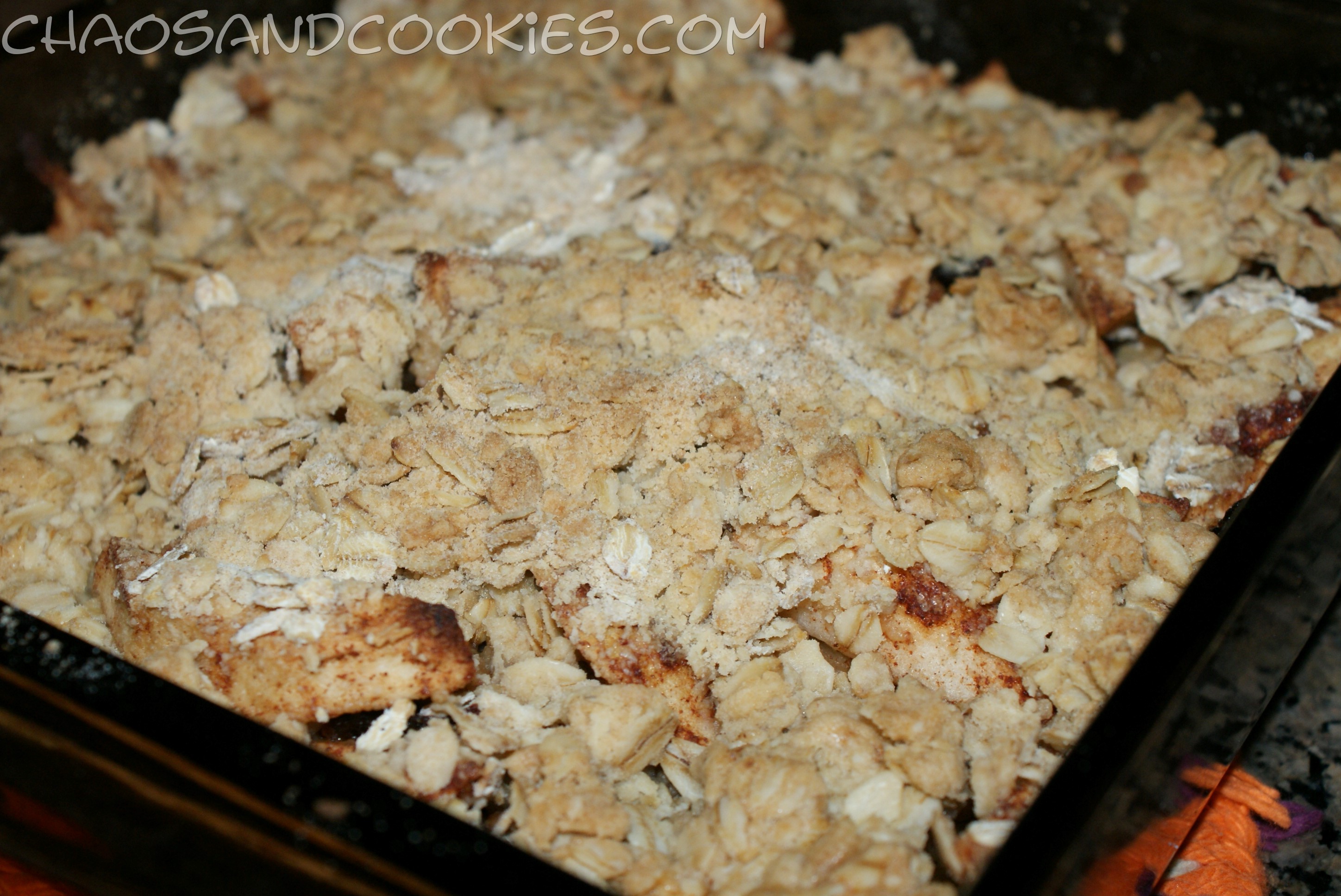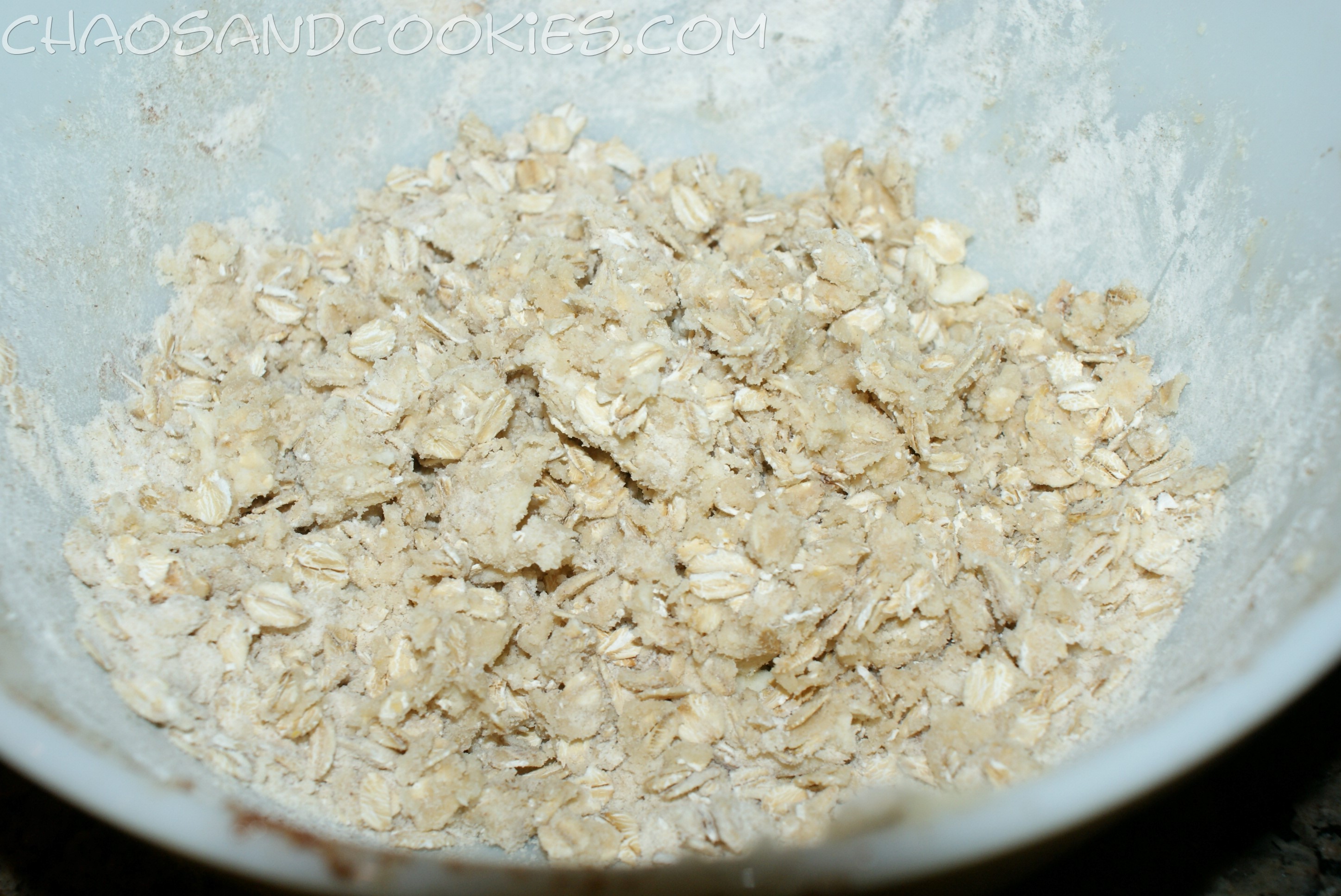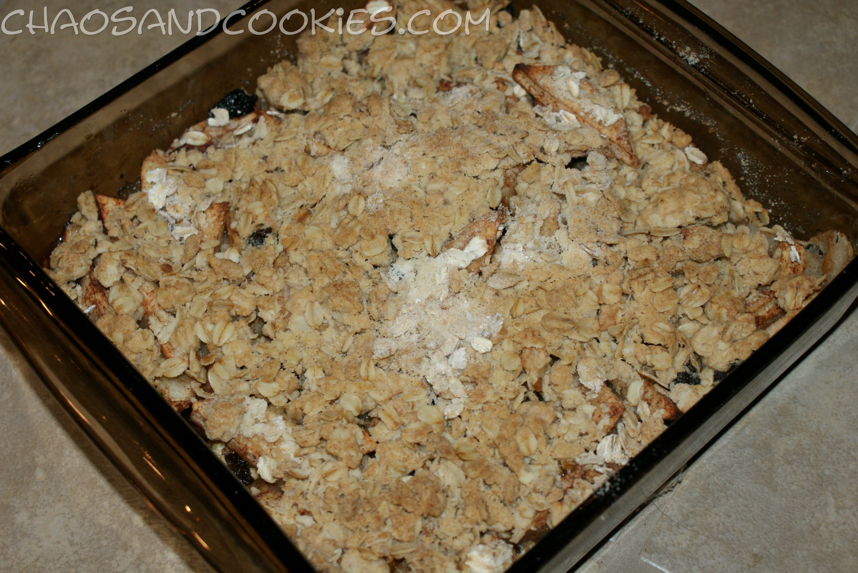 In the same bowl you mixed your apples in mix your flour, brown sugar and oats together until mixed well. Add your butter and use your fingers to mix this all together so that it forms chunks. When the mixtures is ready spread it evenly over your apples.