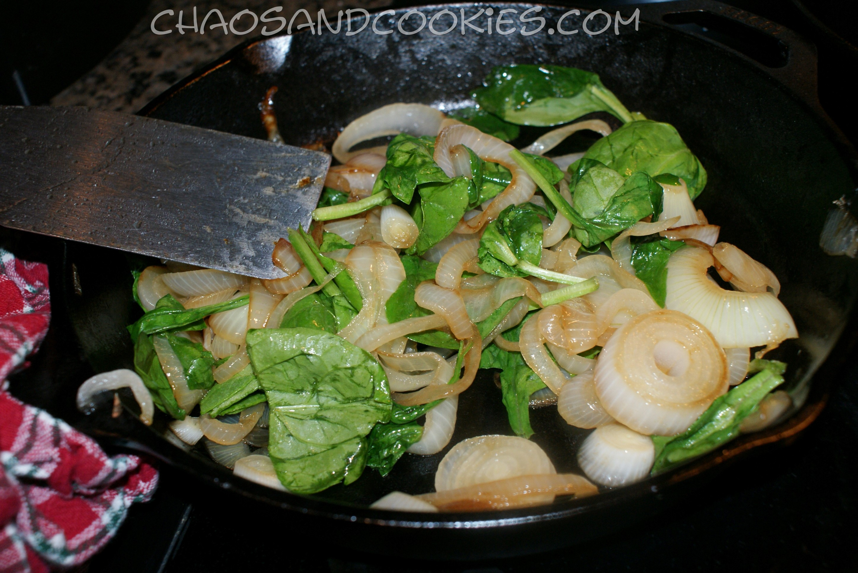 In a fry pan saute your onions until caramelized. When they are caramelized turn the heat off but leave the pan on the the burner and add your spinach and garlic and mix well. While prepping the sandwichs, stir the spinach and onions a couple times until the spinach has become darker and soft.SONY DSC