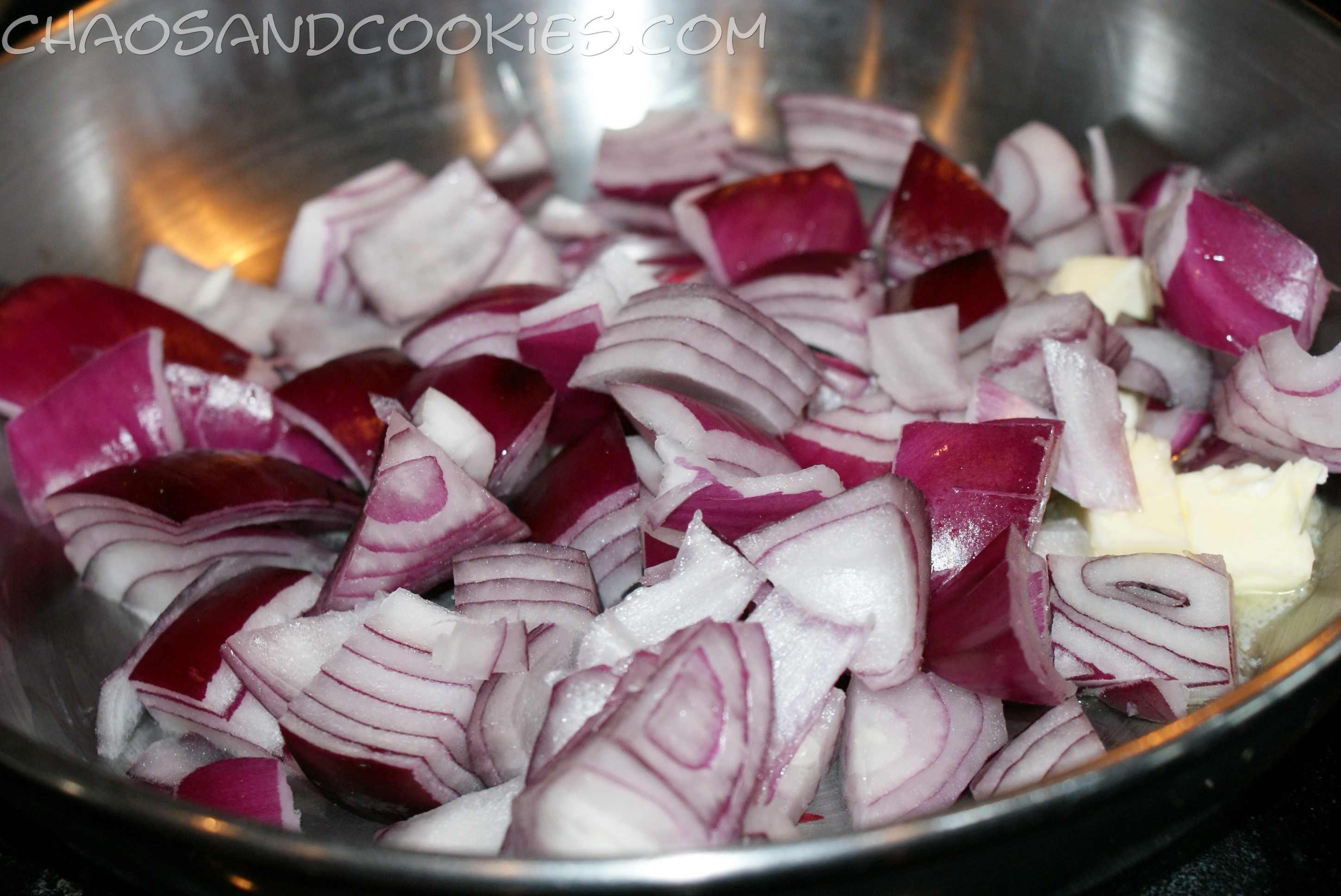 While the chicken cooks, cook your onions in a fry pan with the butter until browned and softened.SONY DSC Now cook your Stove Top Stuffing according to the package. When the stuffing is done mix the onions into it well.SONY DSC SONY DSC