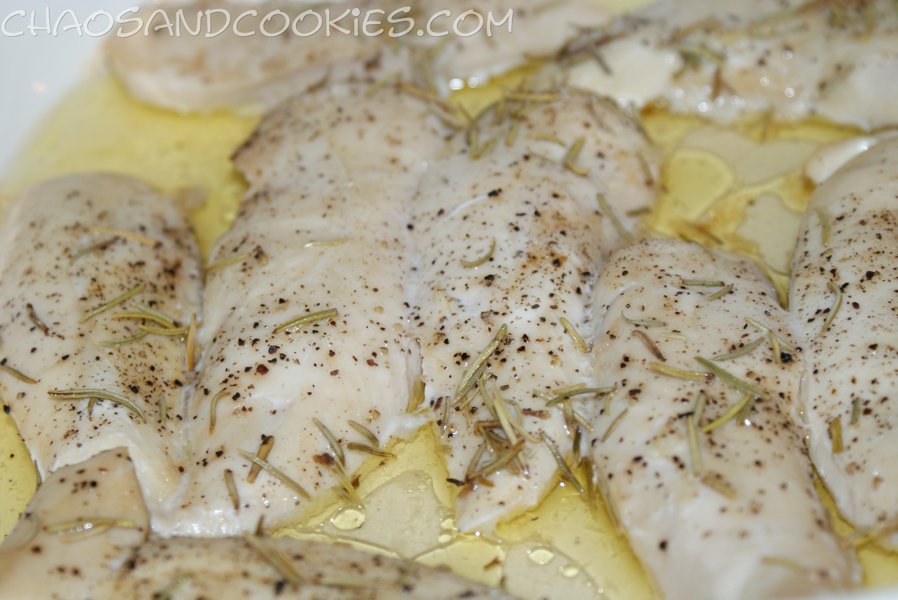 Pre-heat oven to 350 degrees. Place your chicken tenders in a baking dish. Pour olive oil over them, covering well. Sprinkle with Rosemary and some black pepper.SONY DSC