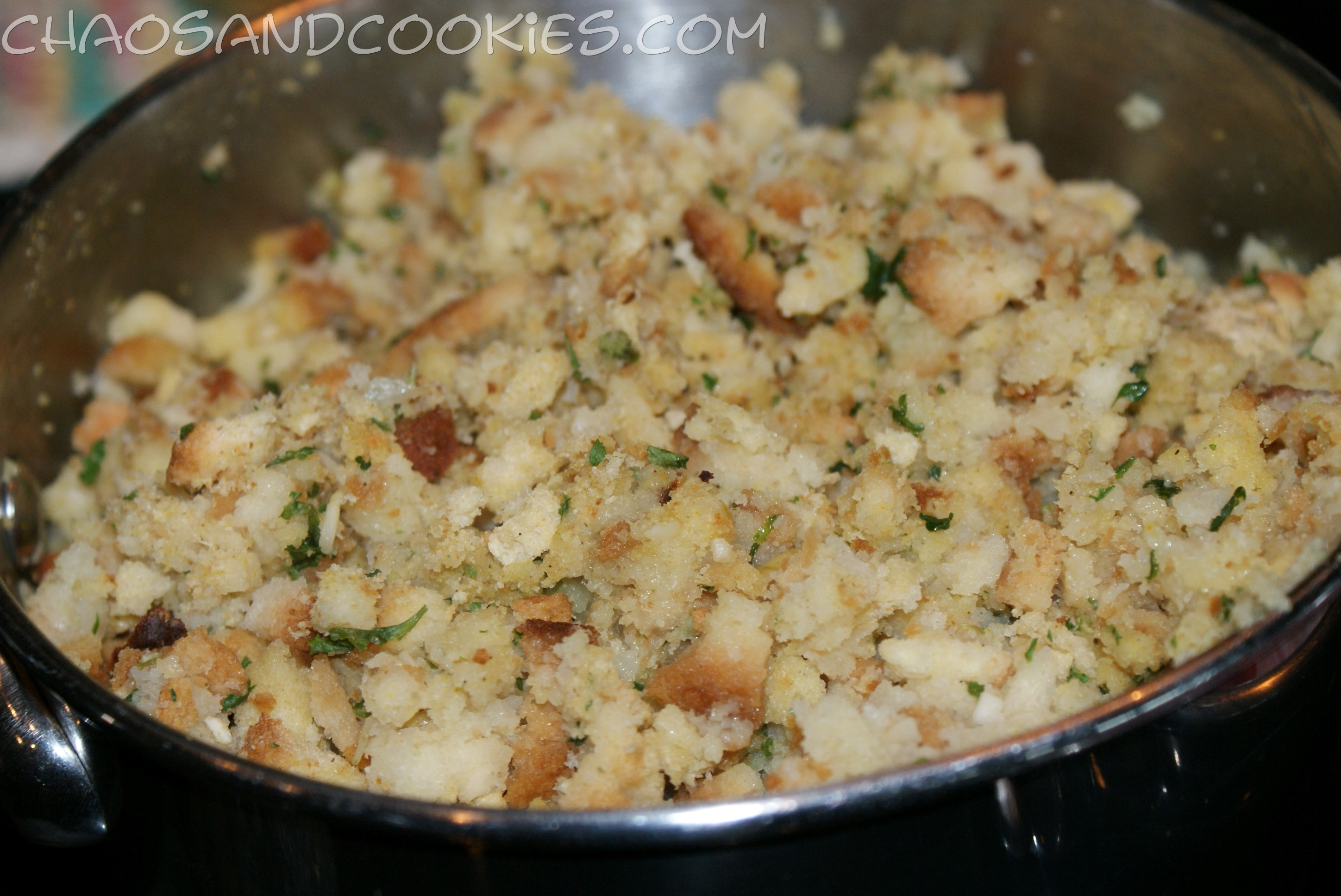 Now place your stuffing into a large baking dish. I use my Pampered Chef Cranberry cooker that I am obsessed with:-) Press the mix down lightly so it sets, but don’t pack it.SONY DSC