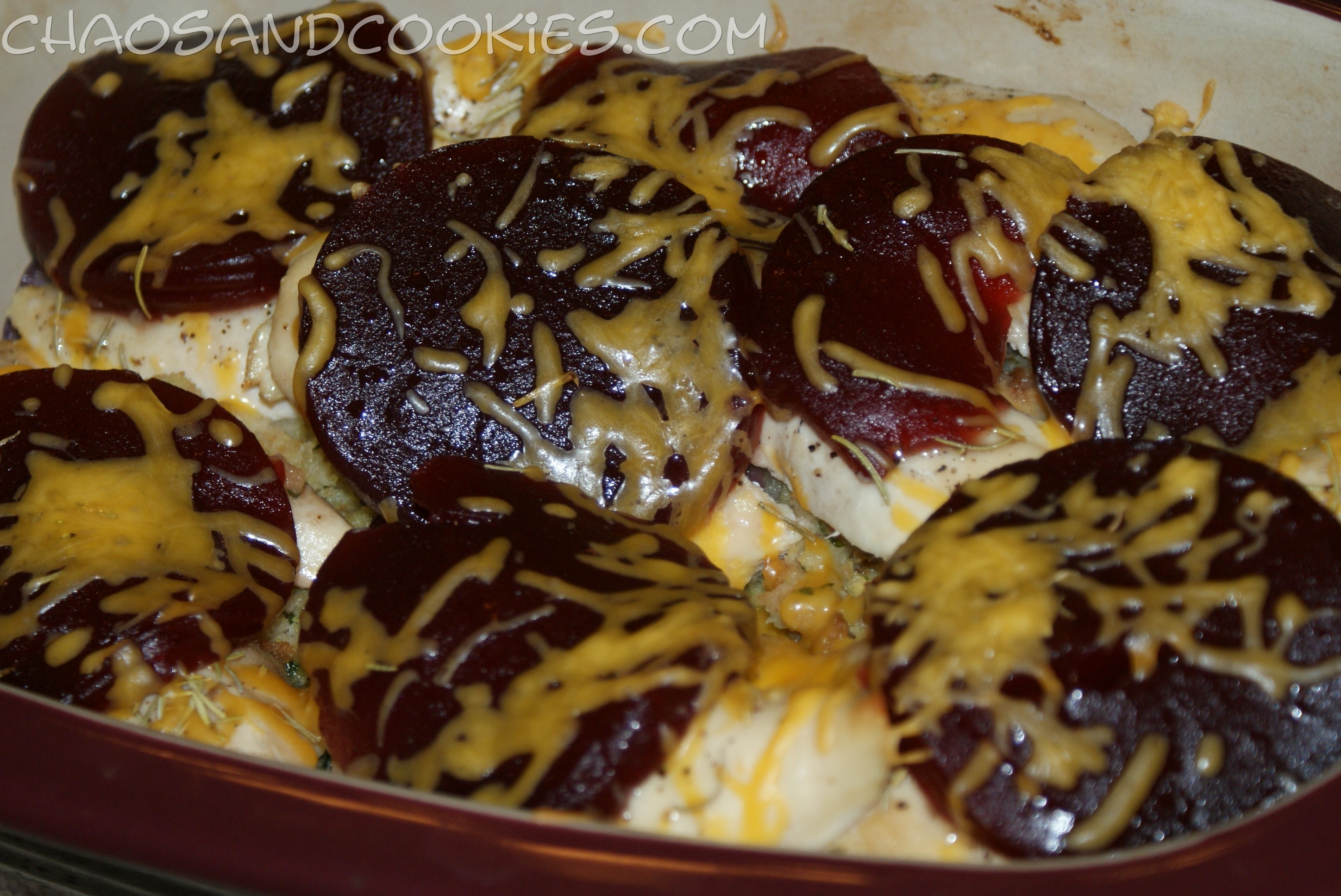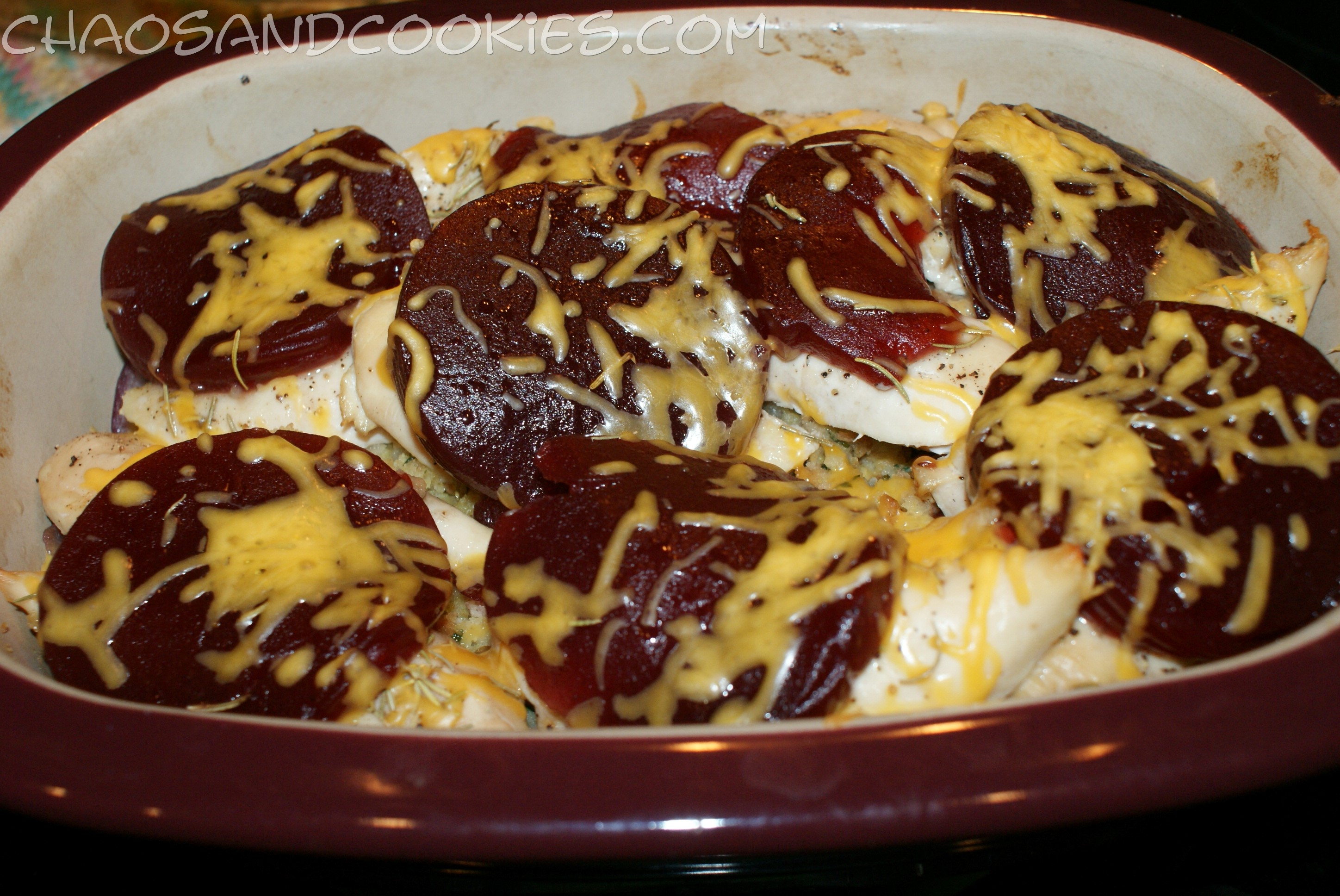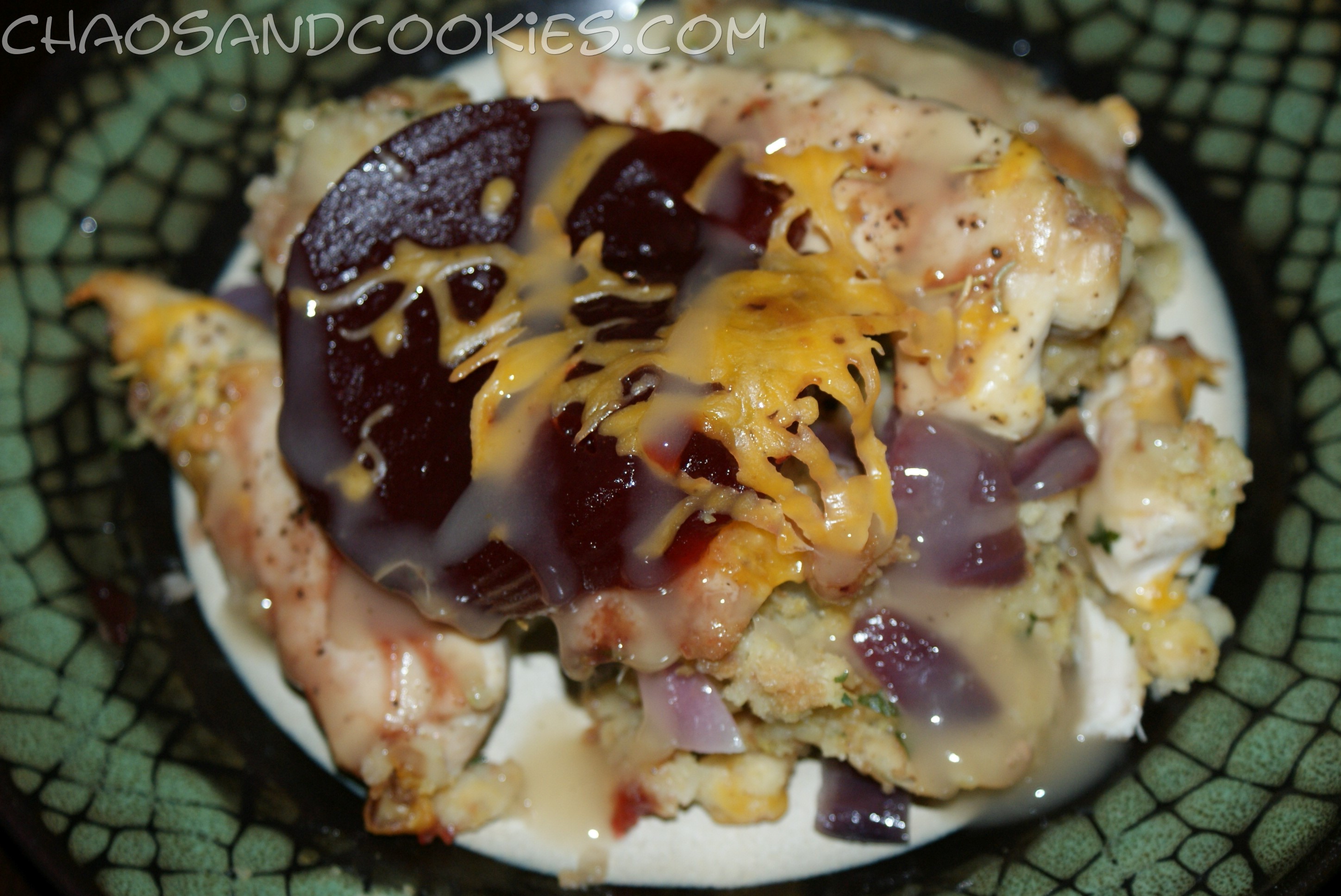 When your chicken is cooked, place the tenders over the stuffing mixture. Now slice your cranberry and place the cranberry over the chicken.SONY DSC