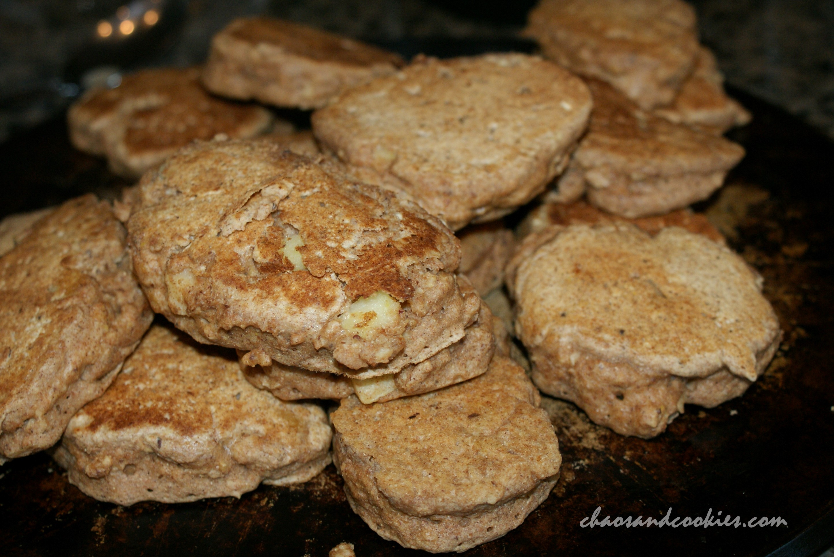 In a large bowl preferably with a spout mix together all the ingredients starting with all dry then adding the wet and apples last. With a large spatula mix together well. This mixture will be fairly thick, definitely thicker than traditional pancake mixture.